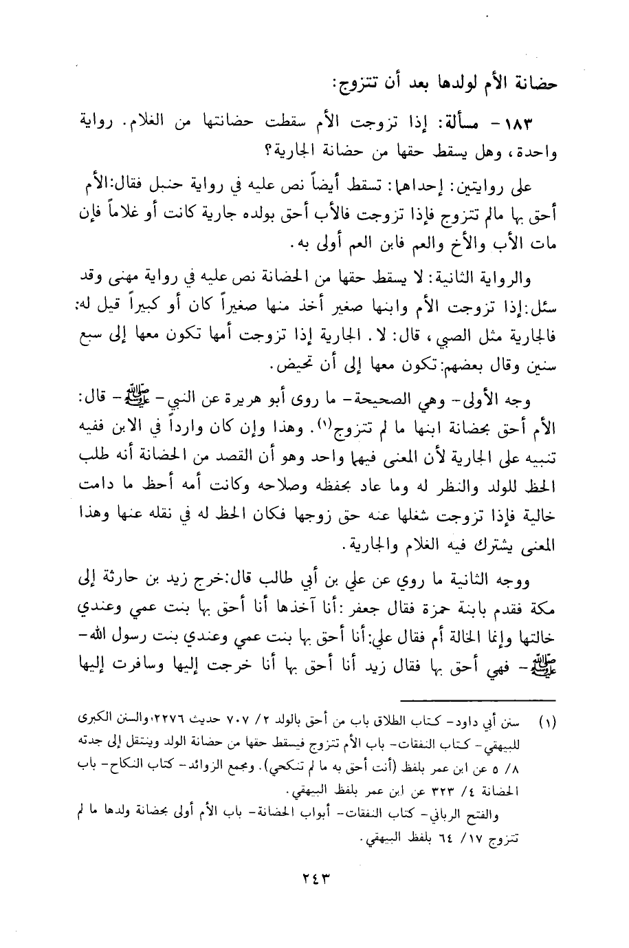 183 - مسألة: إذا تزوجت الأم سقطت حضانتها من الغلام. رواية واحدة، وهل يسقط حقها من حضانة الجارية؟
