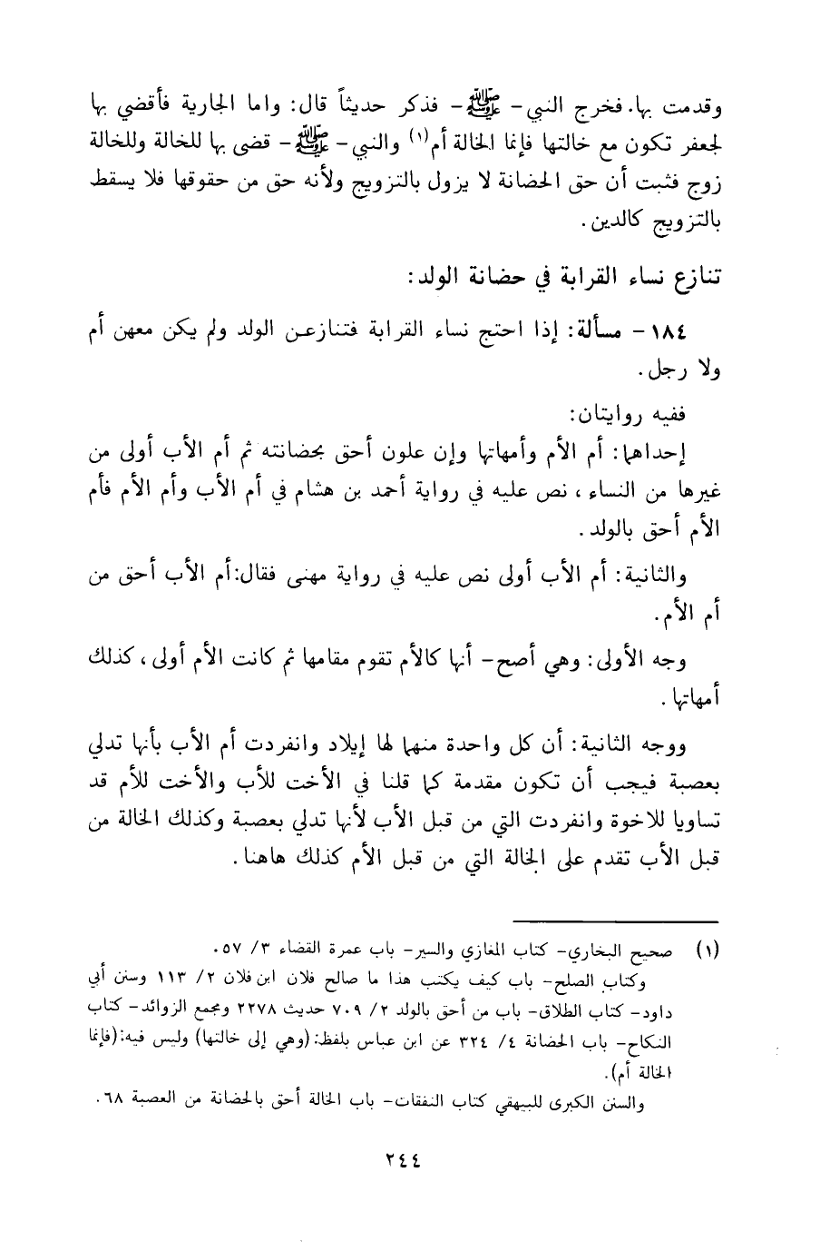 184 - مسألة: إذا احتج نساء القرابة فتنازعن الولد ولم يكن معهن أم ولا رجل.