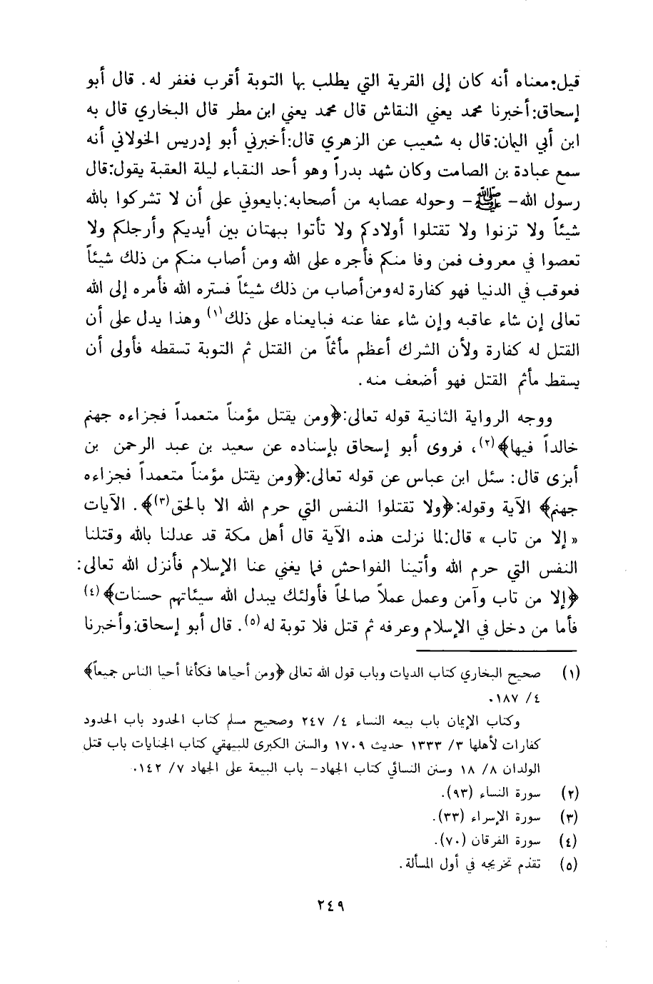 ووجه الرواية الثانية: قوله تعالى: ومن يقتل مؤمناً متعمداً فجزاءه جهنم خالداً فيها، فروى أبو إسحاق بإسناده عن سعيد بن عبد الرحمن بن أبزى قال: سئل ابن عباس عن قوله تعالى: ومن يقتل مؤمناً متعمداً فجزاءه جهنم الآية وقوله: ولا تقتلوا النفس التي حرم الله إلا بالحق. الآيات إلا من تاب قال: لما نزلت هذه الآية قال أهل مكة قد عدلنا بالله وقتلنا النفس التي حرم الله وأتينا الفواحش فما يغني عنا الإسلام فأنزل الله تعالى: إلا من تاب وآمن وعمل عملاً صالحاً فأولئك يبدل الله سيئاتهم حسنات فأما من دخل في الإسلام وعرفه ثم قتل فلا توبة له. قال أبو إسحاق: وأخبرنا