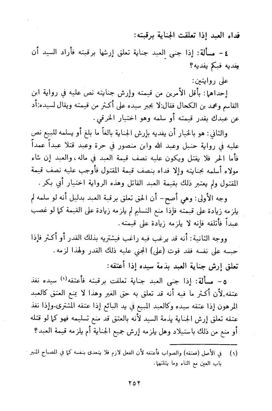 5 - مسألة: إذا جنى العبد جناية تعلقت برقبته فأعتقه سيده نفذ عتقه، لأن أكثر ما فيه أنه قد تعلق به حق الغير وهذا لا يمنع العتق كالعبد المرهون إذا أعتقه سيده وكالعبد المبيع في يد البائع إذا أعتقه المشتري. وإذا نفذ عتقه تعلق إرش الجناية بذمة السيد لأنه بالعتق قد منع تسليمه فهو كما لو قتله أو منع من ذلك باستيلاد وهل يلزمه إرش جميع الجناية أم يلزمه قيمة العبد؟