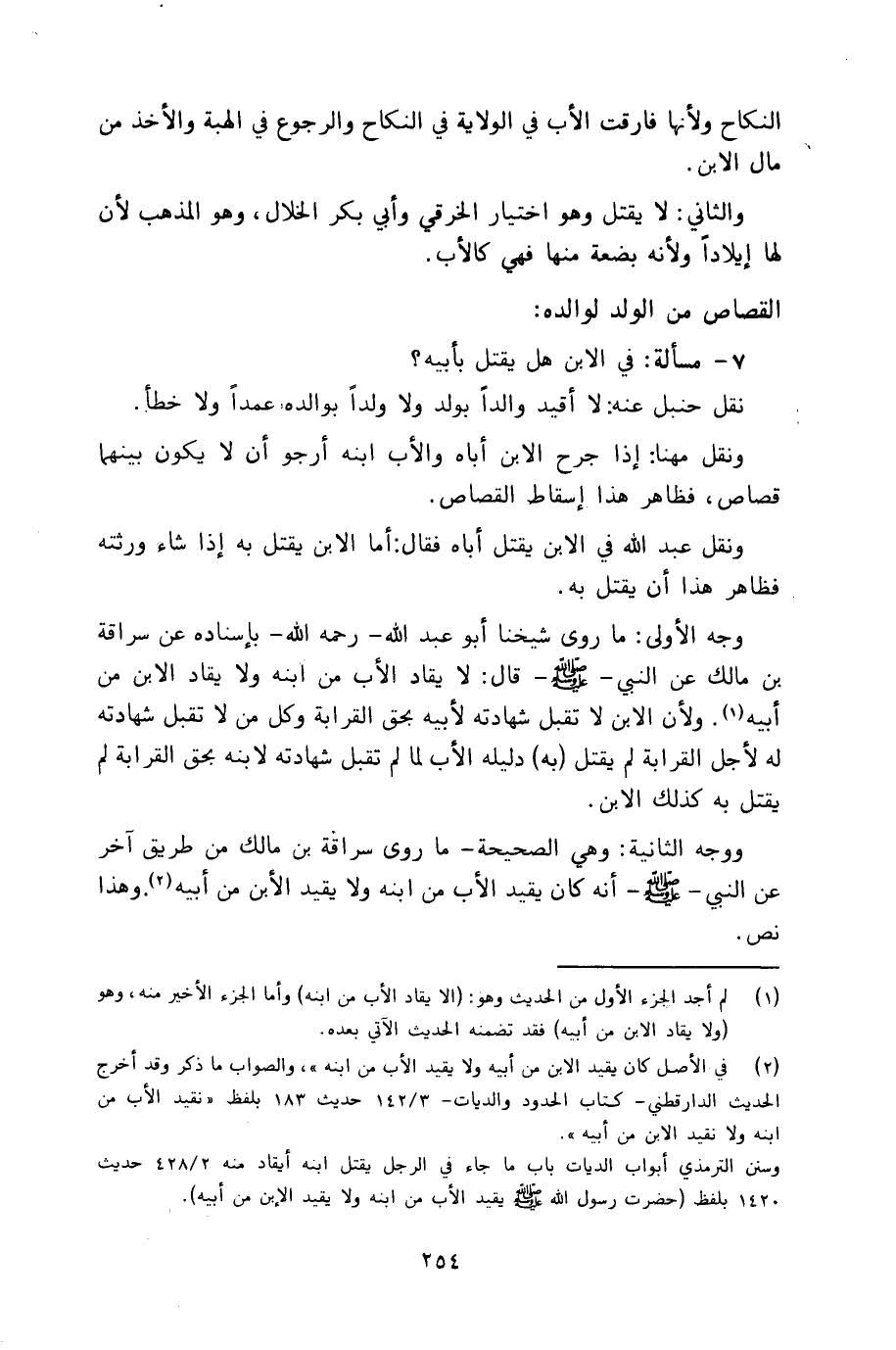 ووجه الثانية: ـ وهي الصحيحة ـ ما روى سراقة بن مالك من طريق آخر عن ـ النبي صلى الله عليه وسلم ـ شأنه كان يقيد الأب من ابنه ولا يقيد الابن من أبيه وهذا نص.