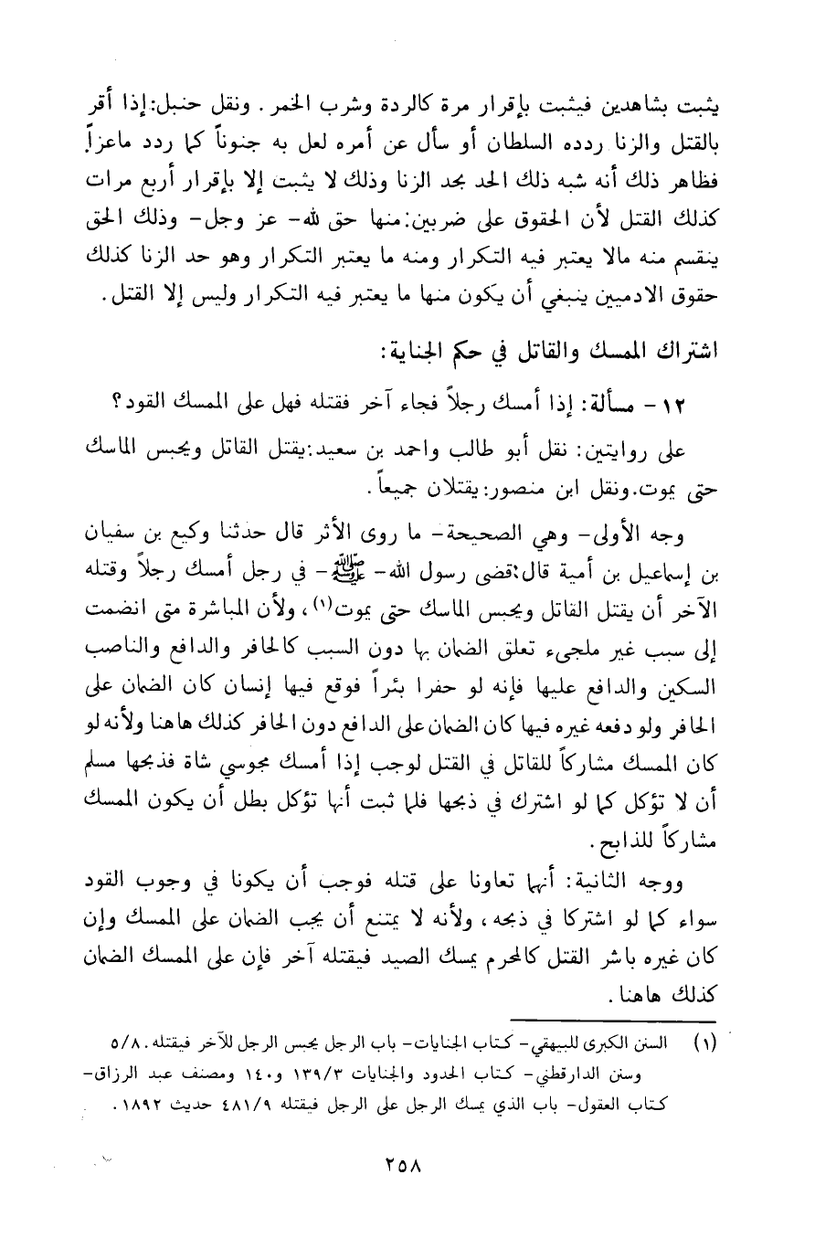 وجه الأولى: ـ وهي الصحيحة ـ ما روى الأثرم قال حدثنا وكيع بن سفيان بن إسماعيل بن أمية قال: قضى رسول الله ـ صلى الله عليه وسلم في رجل أمسك رجلاً وقتله الآخر أن يقتل القاتل ويحبس الماسك حتى يموت، ولأن المباشرة متى انضمت إلى سبب غير ملجىء تعلق الضمان بها دون السبب كالحافر والدافع والناصب السكين والدافع عليها فإنه لو حفر بئراً فوقع فيها إنسان كان الضمان على الحافر ولو دفعه غيره فيها كان الضمان على الدافع دون الحافر كذلك هاهنا ولأنه لو كان الممسك مشاركاً للقاتل في القتل لوجب إذا أمسك مجوسي شاة فذبحها مسلم أن لا تؤكل كما لو اشترك في ذبحها فلما ثبت أنها تؤكل بطل أن يكون الممسك مشاركاً للذابح.