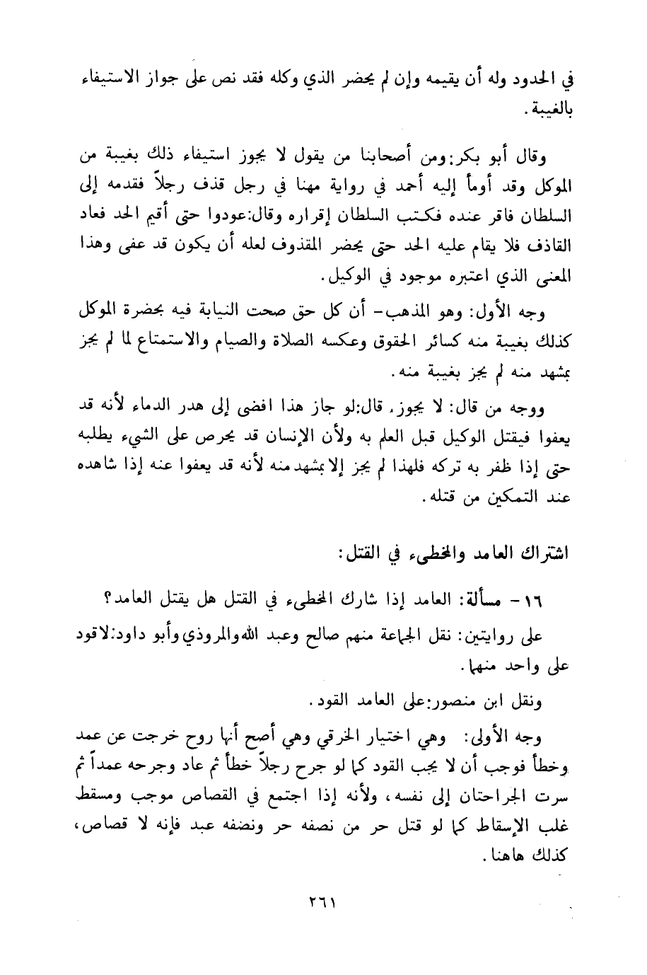 ووجه من قال: لا يجوز. قال: لو جاز هذا أفضى إلى هدر الدماء لأنه قد يعفوا فيقتل الوكيل قبل العلم به ولأن الإنسان قد يحرص على الشيء يطلبه حتى إذا ظفر به تركه فلهذا لم يجز إلا بمشهد منه لأنه قد يعفو عنه إذا شاهده عند التمكين من قتله.