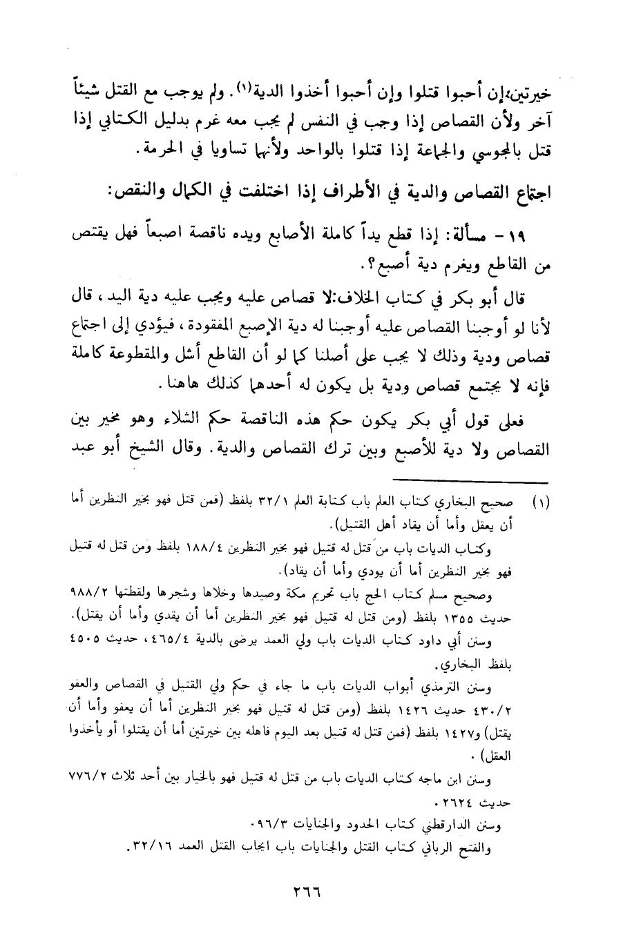19 - مسألة: إذا قطع يداً كاملة الأصابع ويده ناقصة اصبعاً فهل يقتص من القاطع ويغرم دية أصبع؟