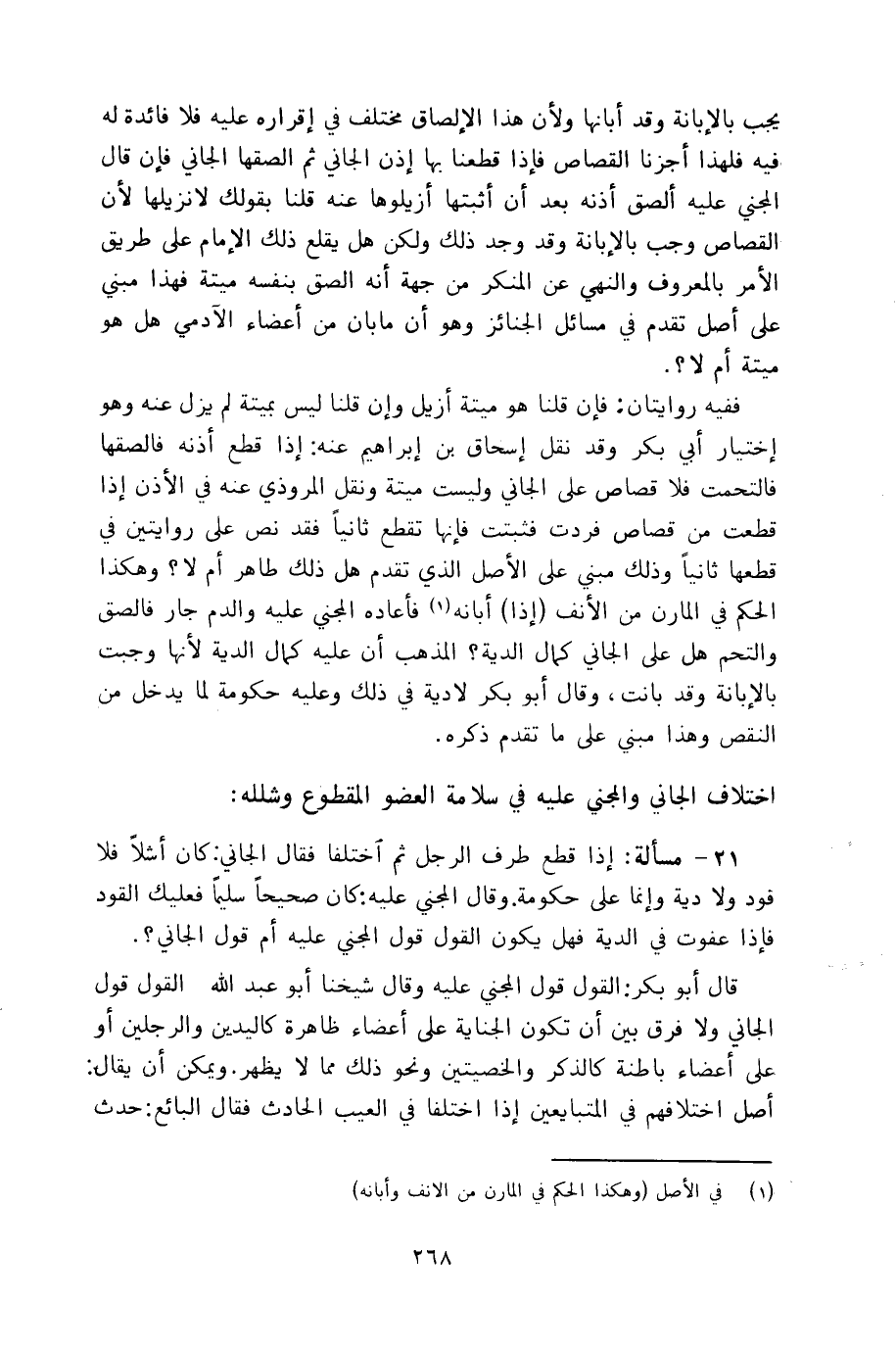 21 - مسألة: إذا قطع طرف الرجل ثم اختلفا فقال الجاني: كان أشلاً فلا فود ولا دية وإنما على حكومة. وقال المجني عليه: كان صحيحاً سليماً فعليك القود فإذا عفوت في الدية فهل يكون القول قول المجني عليه أم قول الجاني؟.