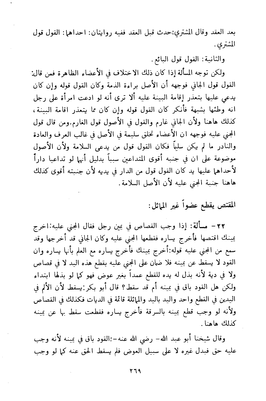 22 - مسألة: إذا وجب القصاص في يمين رجل فقال المجني عليه: اخرج يمينك اقتصها فأخرج يساره فقطعها المجني عليه وكان الجاني قد أخرجها وقد سمع من المجني عليه قوله: أخرج يمينك فأخرج يساره مع العلم بأنها يساره وإن القود لا يسقط عن يمينه فلا ضمان على المجني عليه بقطع هذه اليد لا في قصاص ولا في دية لأنه بذل له يده للقطع عمداً بغير عوض فهو كما لو بذلها ابتداء ولكن هل القود باق في يمينه أم قد سقط؟ قال أبو بكر: يسقط لأن الألم في اليدين في القطع واحد واليد والمماثلة قائمة في الديات فكذلك في القصاص ولأنه لو وجب قطع يمينه بالسرقة فأخرج يساره فقطعت سقط بها عن يمينه كذلك هاهنا.