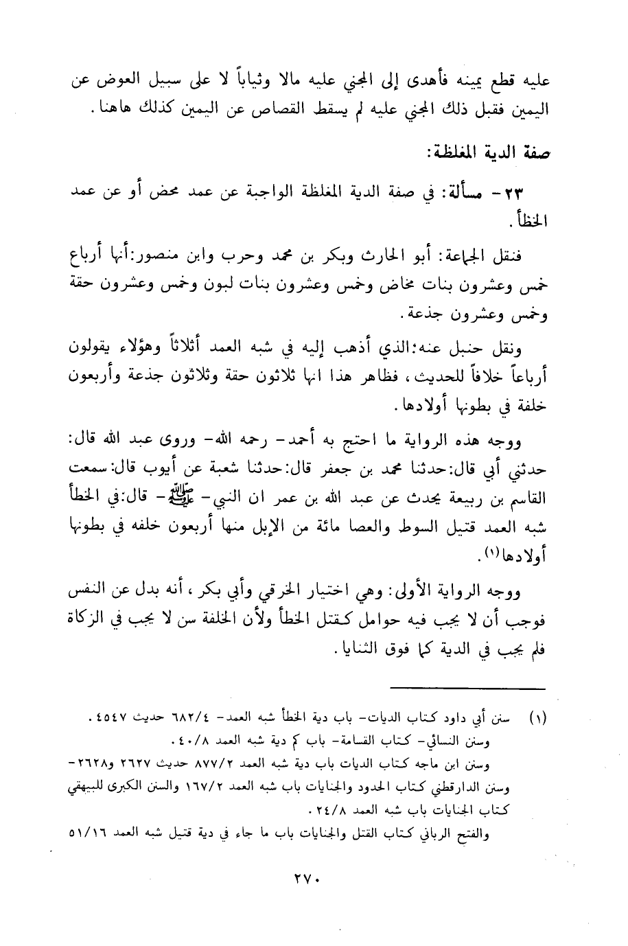 ووجه هذه الرواية ما احتج به أحمد ـ رحمه الله ـ وروى عبد الله قال: حدثني أبي قال: حدثنا محمد بن جعفر قال: حدثنا شعبة عن أيوب قال: سمعت القاسم بن ربيعة يحدث عن عبد الله بن عمر أن ـ النبي صلى الله عليه وسلم ـ قال: في الخطأ شبه العمد قتيل السوط والعصا مائة من الإبل منها أربعون خلفه في بطونها أولادها.
