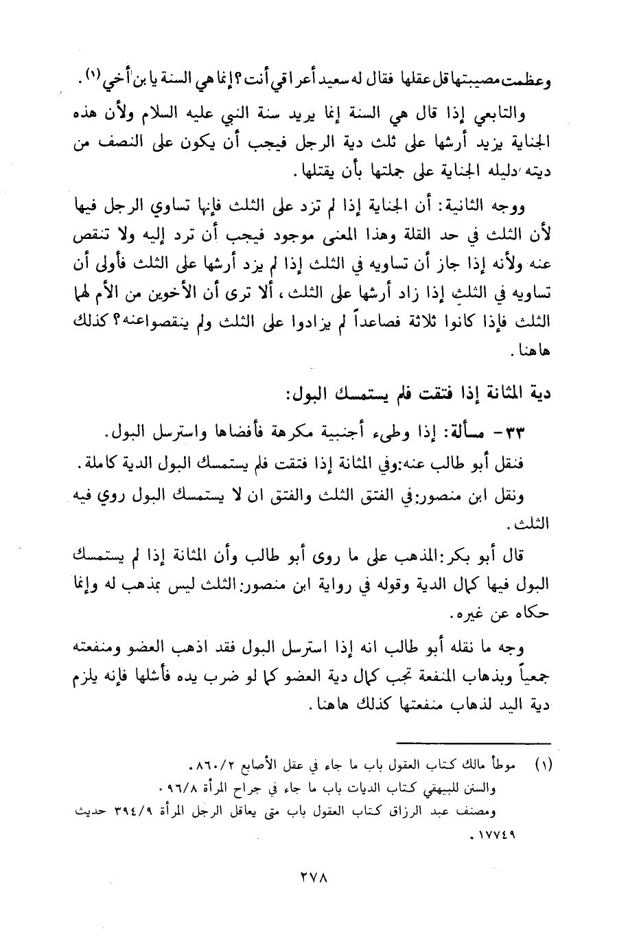 قال أبو بكر: المذهب على ما روى أبو طالب وأن المثانة: إذا لم يستمسك البول فيها كمال الدية وقوله في رواية ابن منصور: الثلث ليس بمذهب له وإنما حكاه عن غيره.