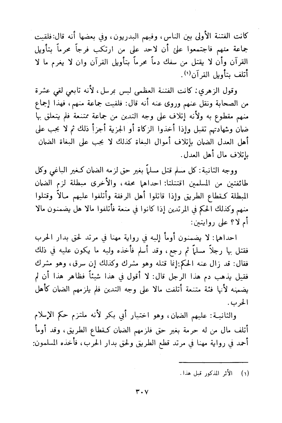 كانت الفتنة الأولى بين الناس، وفيهم البدريون، وفي بعضها أنه قال: فلقيت جماعة منهم فاجتمعوا على أن لا حد على من ارتكب فرجاً محرماً بتأويل القرآن وأن لا يقتل من سفك دماً محرماً بتأويل القرآن وأن لا يغرم ما لا أتلف بتأويل القرآن.