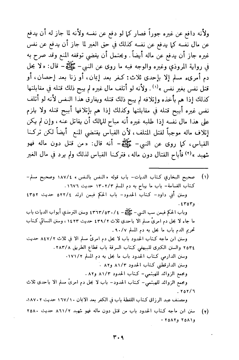 ولأنه دافع عن غيره جوراً فصار كما لو دفع عن نفسه ولأنه لما جاز له أن يدفع عن مال نفسه كما يدفع عن نفسه كذلك في حق الغير لما جاز أن يدفع عن نفس غيره جاز أن يدفع عن ماله أيضاً. ويحتمل أن يقضي توقفه المنع وقد صرح به. في رواية المروذي وغيره والوجه فيه ما روي عن ـ النبي صلى الله عليه وسلم ـ قال: لا يحل دم امرىء مسلم إلا بإحدى ثلاث: كفر بعد إيمان، أو زنا بعد إحصان، أو قتل نفس بغير نفس. ولأنه لو أتلف مال غيره لم يبح ذلك قتله في مقابلتها كذلك إذا هم بأخذه وإتلافه لم يبح ذلك قتله ويفارق هذا النفس لأنه لو أتلف نفس غيره أبيح قتله في مقابلتها وكذلك إذا هم بإتلافها أبيح قتله ولا يلزم على هذا مال نفسه إذا طلبه غيره أنه مباح للمالك أن يقاتل عنه، وإن لم يكن إتلاف ماله موجباً لقتل المتلف، لأن القياس يقتضي المنع أيضاً لكن تركنا القياس، كما روي عن ـ النبي صلى الله عليه وسلم ـ أنه قال: من قتل دون ماله فهو شهيد فأباح القتال دون ماله، فتركنا القياس لذلك ولم يرد في مال الغير