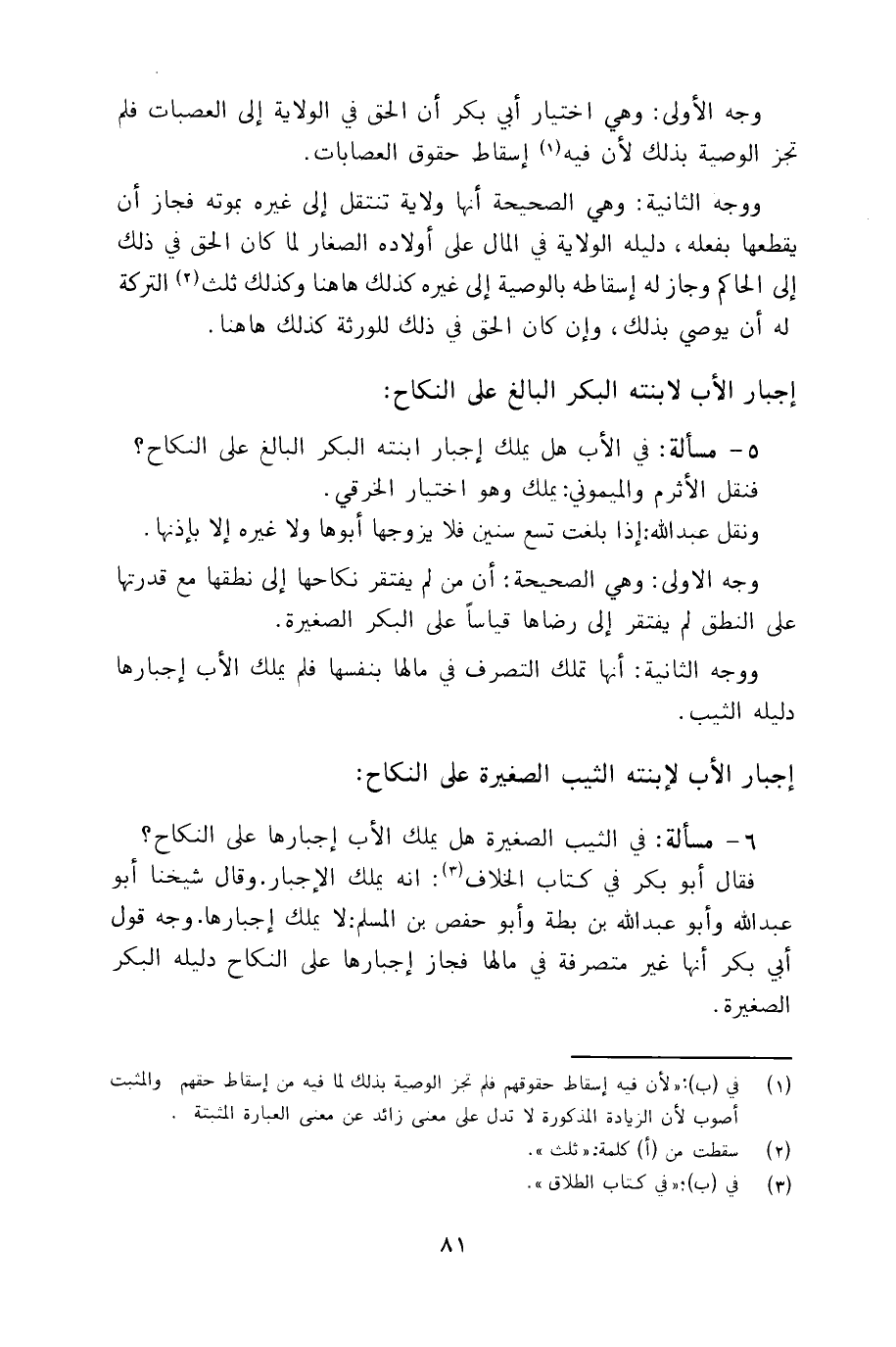 ووجه الثانية: وهي الصحيحة أنها ولاية تنتقل إلى غيره بموته فجاز أن يقطعها بفعله، دليله الولاية في المال على أولاده الصغار لما كان الحق في ذلك إلى الحاكم وجاز له إسقاطه بالوصية إلى غيره كذلك هاهنا وكذلك ثلث التركة له أن يوصي بذلك، وإن كان الحق في ذلك للورثة كذلك هاهنا.