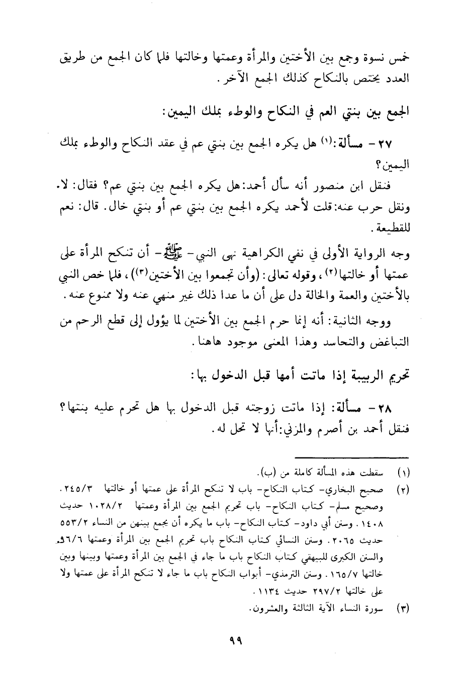 27 - مسألة: هل يكره الجمع بين بنتي عم في عقد النكاح والوطء بملك اليمين؟