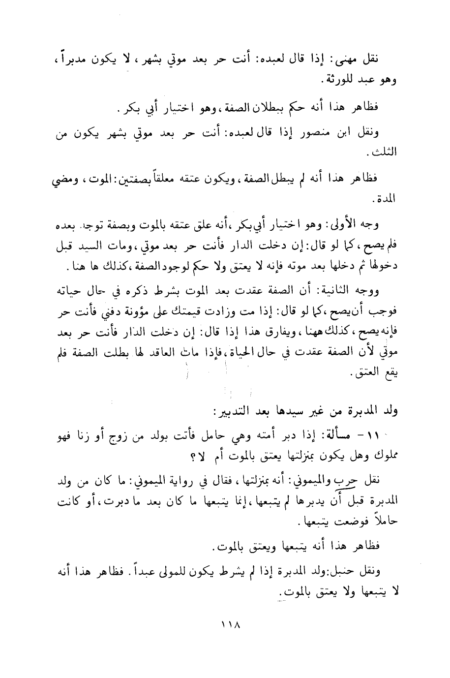 11 - مسألة: إذا دبر أمته وهي حامل فأنت بولد من زوج أو زنا فهو مملوك وهل يكون بمنزلتها يعتق بالموت أم لا؟ نقل حرب والميموني: أنه بمنزلتها، فقال في رواية الميموني: ما كان من ولد المدبرة قبل أن يدبرها لم يتبعها إنما يتبعها ما كان بعد ما دبرت، أو كانت حاملاً فوضعت يتبعها.