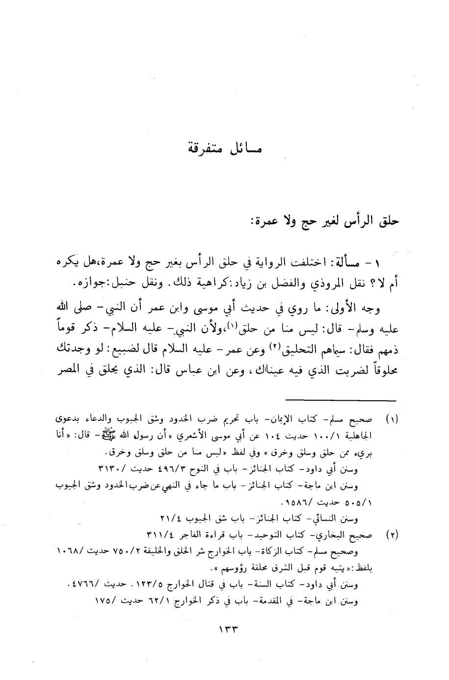 1 - مسألة اختلفت الرواية في حلق الرأس بغير رحج ولا عمرة، هل يكره أم لا؟ نقل المروذي والفضل بن زياد: كراهية ذلك. ونقل حنبل: جوازه.
