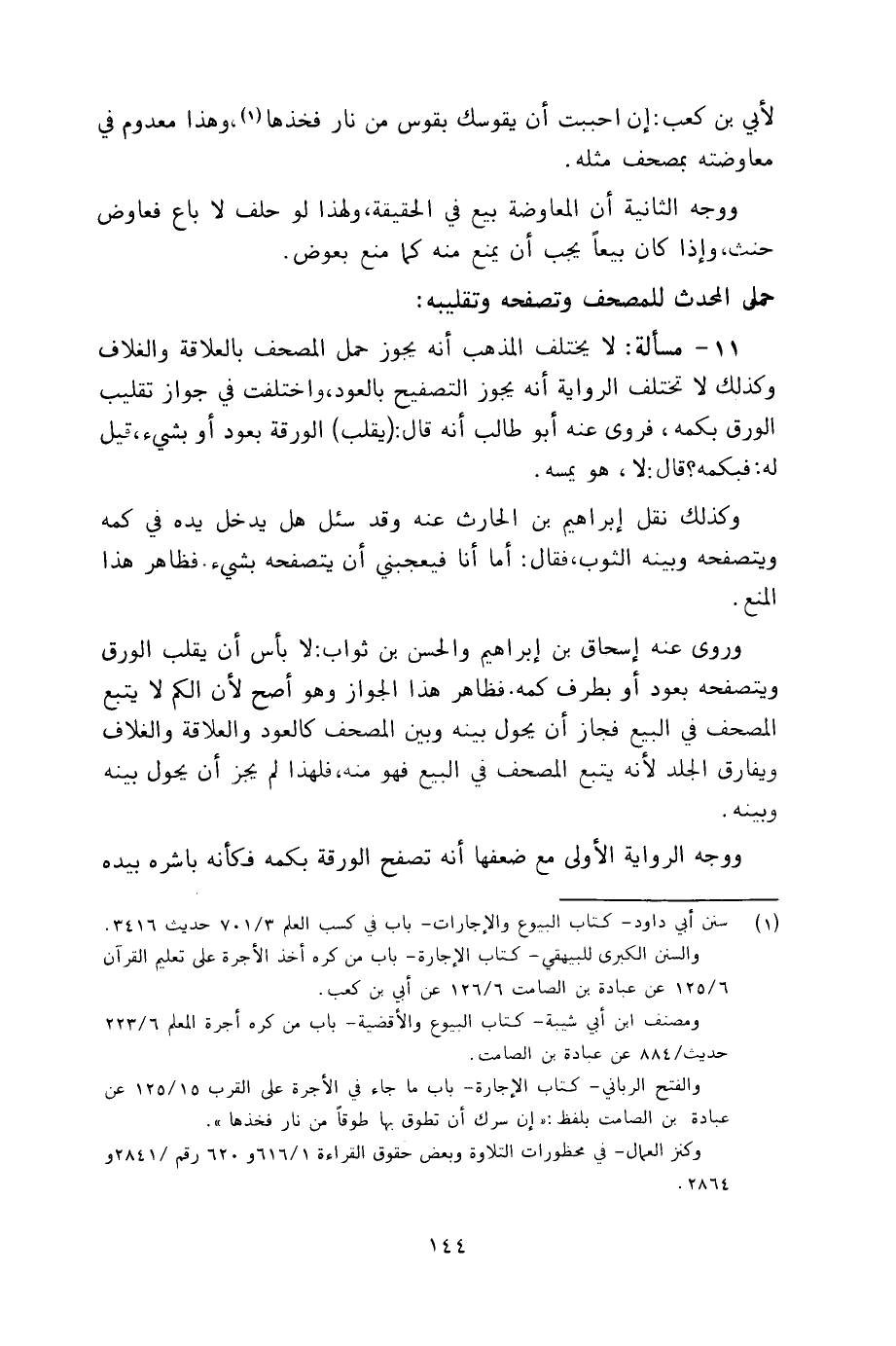 لأبي بن كعب: إن أحببت أن يقوسك بقوس من نار فخذها، وهذا معدوم في معاوضته بمصحف مثله.