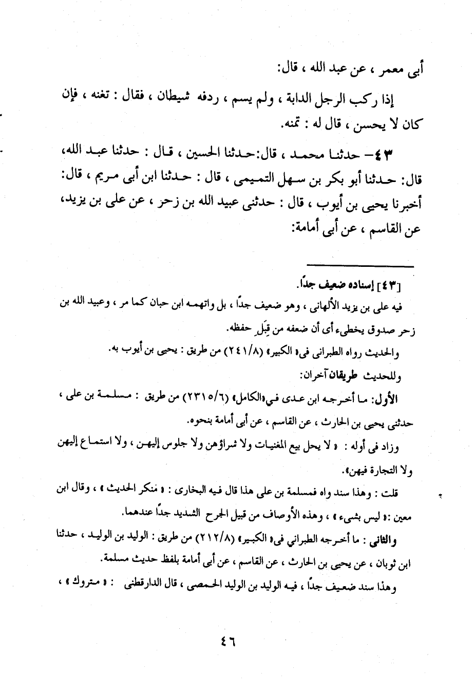 41 - حَدَّثَنَا مُحَمَّدٌ، قَالَ: حَدَّثَنَا الْحُسَيْنُ، قَالَ: حَدَّثَنَا عَبْدُ اللَّهِ، قَالَ: حَدَّثَنَا أَبُو بَكْرِ بْنُ سَهْلٍ التَّمِيمِيُّ , قَالَ: حَدَّثَنَا ابْنُ أَبَى مَرْيَمَ , قَالَ: أَخْبَرَنَا يَحْيَى بْنُ أَيُّوبَ , قَالَ: حَدَّثَنِي عُبَيْدُ اللَّهِ بْنُ زَحْرٍ , عَنْ عَلِيِّ بْنِ يَزِيدَ , عَنِ الْقَاسِمِ , عَنْ أَبَى أُمَامَةَ -[47]- أَنَّ رَسُولَ اللَّهِ صَلَّى اللَّهُ عَلَيْهِ وَسَلَّمَ قَالَ: «§مَا رَفَعَ أَحَدٌ صَوْتَهُ بِغِنَاءٍ إِلَّا بَعَثَ اللَّهُ عَزَّ وَجَلَّ إِلَيْهِ بِشَيْطَانَيْنِ يَجْلِسَانِ عَلَى مَنْكِبَيْهِ , يَضْرِبَانِ بِأَعْقَابِهِمَا عَلَى صَدْرِهِ حَتَّى يُمْسِكَ»