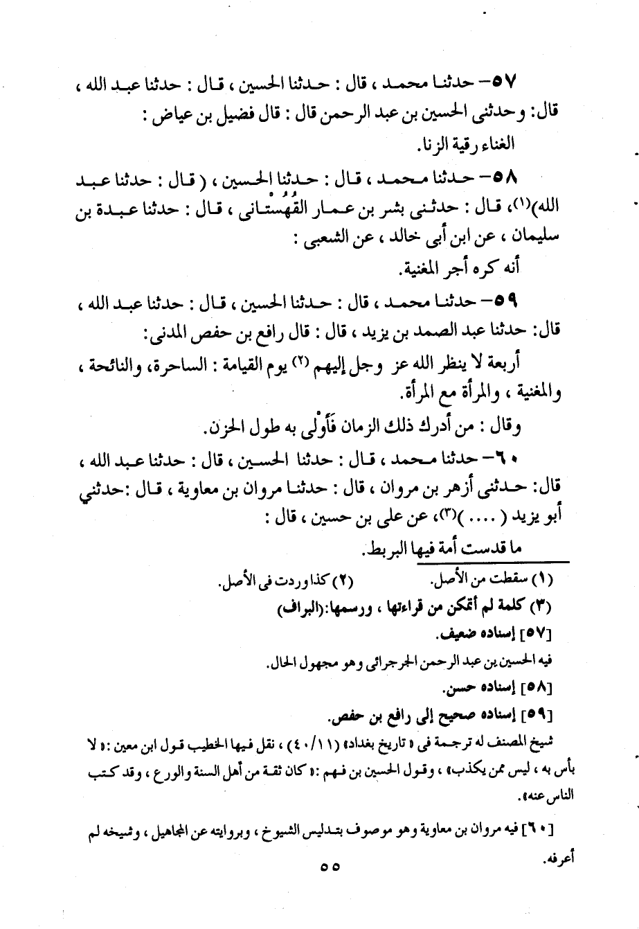 55 - حَدَّثَنَا مُحَمَّدٌ، قَالَ: حَدَّثَنَا الْحُسَيْنُ، قَالَ: حَدَّثَنَا عَبْدُ اللَّهِ، قَالَ: وَحَدَّثَنِي الْحُسَيْنُ بْنُ عَبْدِ الرَّحْمَنِ , قَالَ: قَالَ فُضَيْلُ بْنُ عِيَاضٍ: " §الْغِنَاءُ رُقْيَةُ الزِّنَا