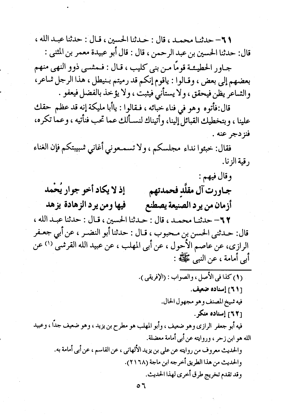 59 - حَدَّثَنَا مُحَمَّدٌ، قَالَ: حَدَّثَنَا الْحُسَيْنُ، قَالَ: حَدَّثَنَا عَبْدُ اللَّهِ، قَالَ: حَدَّثَنَا الْحُسَيْنُ بْنُ عَبْدِ الرَّحْمَنِ , قَالَ: قَالَ أَبُو عُبَيْدَةَ مَعْمَرُ بْنُ الْمُثَنَّى: " جَاوَرَ الْحُطَيْئَةُ قَوْمًا مِنْ بَنِي كُلَيْبٍ , قَالَ: فَمَشَى ذَوُو النُّهَى مِنْهُمْ بَعْضُهُمْ إِلَى بَعْضٍ , وَقَالُوا: يَا قَوْمُ إِنَّكُمْ قَدْ رَمَيْتُمْ بِنَيْطَلٍ , هَذَا الرَّجُلُ شَاعِرٌ , وَالشَّاعِرُ يَظُنَّ فَيُحَقِّقُ , وَلَا يَسْتَأْنِي فَيُثْبِتُ , وَلَا يُؤْخَذُ بِالْفَضْلِ فَيَعْفُو , قَالَ: فَأَتَوْهُ وَهُوَ فِي فَنَاءِ خِبَائِهِ , فَقَالُوا: يَا أَبَا مُلَيْكَةَ إِنَّهُ قَدْ عَظُمَ حَقُّكَ عَلَيْنَا , وَبِتَخْطِيكَ الْقَبَائِلَ إِلَيْنَا، وَأَتَيْنَاكَ لِنَسْأَلَكَ عَمَّا تُحِبُّ فَنَأْتِيَهِ , وَعَمَّا تَكْرَهُ , فَنَزْدَجِرَ عَنْهُ , فَقَالَ: خَبِّئُوا نِدَاءَ مَجْلِسِكُمْ , وَلَا تُسْمِعُونِي أَغَانِيَ شَبِيبَتِكُمْ؛ فَإِنَّ §الْغِنَاءَ رُقْيَةُ الزِّنَا، وَقَالَ فِيهِمْ: