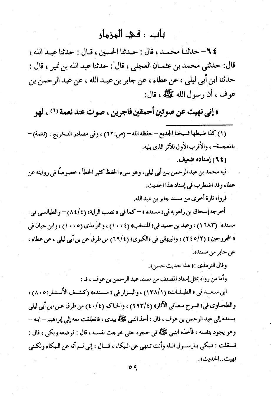 62 - حَدَّثَنَا مُحَمَّدٌ، قَالَ: حَدَّثَنَا الْحُسَيْنُ، قَالَ: حَدَّثَنَا عَبْدُ اللَّهِ، قَالَ: حَدَّثَنِي مُحَمَّدُ بْنُ عُثْمَانَ الْعِجْلِيُّ , قَالَ: حَدَّثَنَا عَبْدُ اللَّهِ بْنُ نُمَيْرٍ , قَالَ: حَدَّثَنَا ابْنُ أَبَى لَيْلَى , عَنْ عَطَاءٍ , عَنْ جَابِرِ بْنِ عَبْدِ اللَّهِ , عَنْ عَبْدِ الرَّحْمَنِ بْنِ عَوْفٍ , أَنَّ رَسُولَ اللَّهِ صَلَّى اللَّهُ عَلَيْهِ وَسَلَّمَ , قَالَ: " إِنَّى §نَهَيْتُ عَنْ صَوْتَيْنِ أَحْمَقَيْنِ فَاجِرَيْنِ: صَوْتٌ عِنْدَ نِعْمَةٍ , لَهْوٌ -[60]- وَلَعِبٌ , وَمَزَامِيرُ شَيْطَانٍ , وَصَوْتٌ عِنْدَ مُصِيبَةٍ , خَمْشُ وُجُوهٍ , وَشَقُّ جُيُوبٍ , وَرَنَّةُ شَيْطَانٍ "