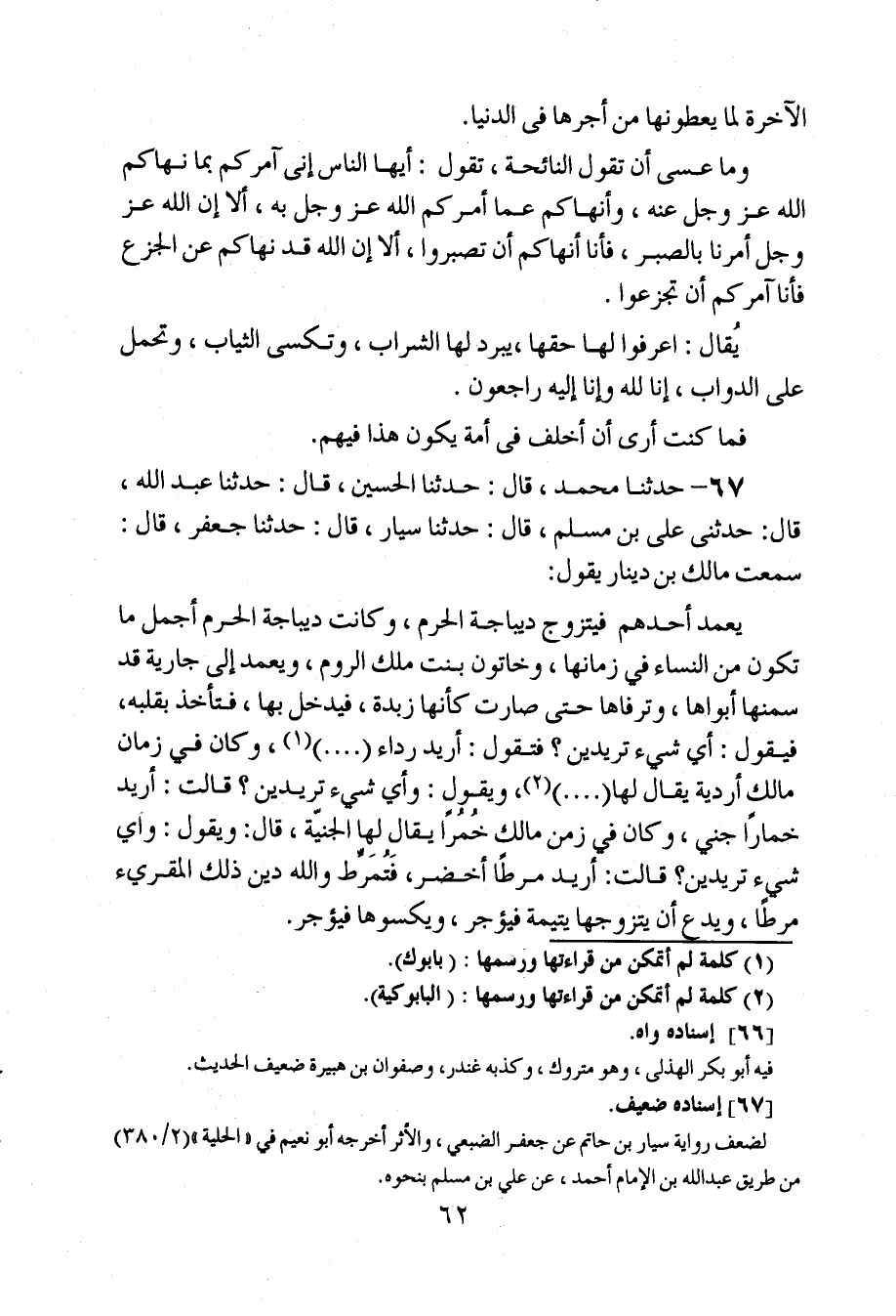 65 - حَدَّثَنَا مُحَمَّدٌ، قَالَ: حَدَّثَنَا الْحُسَيْنُ، قَالَ: حَدَّثَنَا عَبْدُ اللَّهِ، قَالَ: حَدَّثَنِي عَلِيُّ بْنُ مُسْلِمٍ , قَالَ: حَدَّثَنَا سَيَّارٌ , قَالَ: حَدَّثَنَا جَعْفَرٌ , قَالَ: سَمِعْتُ مَالِكَ بْنَ دِينَارٍ , يَقُولُ: " §يَعْمِدُ أَحَدُهُمْ فَيَتَزَوَّجُ دِيبَاجَةَ الْحَرَمِ , وَكَانَتْ دِيبَاجَةُ الْحَرَمِ أجْمَلُ مَا تَكُونُ مِنَ النِّسَاءِ فِي زَمَانِهَا , وَخَاتُونُ بِنْتُ مَلَكِ الرُّومِ , وَيَعْمِدُ إِلَى جَارِيَةٍ قَدْ سَمَّنَهَا أَبَوَاهَا , وَتَرَّفَاهَا حَتَّى صَارَتْ كَأَنَّهَا زُبْدَةٌ , فَيَدْخُلُ بِهَا , فَتَأْخُذُ بِقَلْبِهِ , فَيَقُولُ: أَيُّ شَيْءٍ تُرِيدِينَ؟ فَتَقُولُ: أُرِيدُ رِدَاءَ بَابُوكَ , وَكَانَ فِي زَمَانِ مَالِكٍ أَرْدِيَةٌ يُقَالُ لَهَا: الْبَابُوكِيَّةُ , وَيَقُولُ: أَيُّ شَيْءٍ تُرِيدِينَ؟ قَالَتْ: أُرِيدُ خِمَارًا جِنِّيًّا , وَكَانَ فِي زَمَنِ مَالِكٍ خُمُرٌ يُقَالُ لَهَا الْجِنِّيَّةُ , قَالَ: وَيَقُولُ: وَأَيُّ شَيْءٍ تُرِيدِينَ؟ قَالَتْ: أُرِيدُ مِرْطًا أَخْضَرَ , فَتُمَرِّطُ وَاللَّهِ دِينَ ذَلِكَ الْمُقْرِئِ مَرْطًا , وَيَدَعُ أَنْ يَتَزَوَّجَهَا يَتِيمَةً فَيُؤْجَرَ , وَيَكْسُوَهَا فَيُؤْجَرَ
