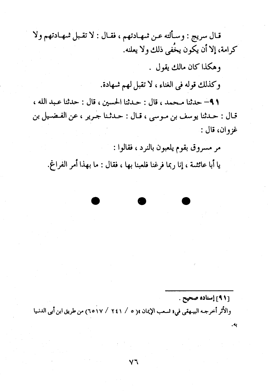 86 - حَدَّثَنَا مُحَمَّدٌ، قَالَ: حَدَّثَنَا الْحُسَيْنُ، قَالَ: حَدَّثَنَا عَبْدُ اللَّهِ، قَالَ: حَدَّثَنَا يُوسُفُ بْنُ مُوسَى , قَالَ: حَدَّثَنَا جَرِيرٌ , عَنِ الْفُضَيْلِ بْنِ غَزْوَانَ , قَالَ: مَرَّ مَسْرُوقٌ بِقَوْمٍ يَلْعَبُونَ بِالنَّرْدِ , فَقَالُوا: يَا أَبَا عَائِشَةَ , إِنَّا رُبَّمَا فَرَغْنَا فَلَعِبْنَا بِهَا , فَقَالَ: §مَا بِهَذَا أُمِرَ الْفُرَّاغُ "