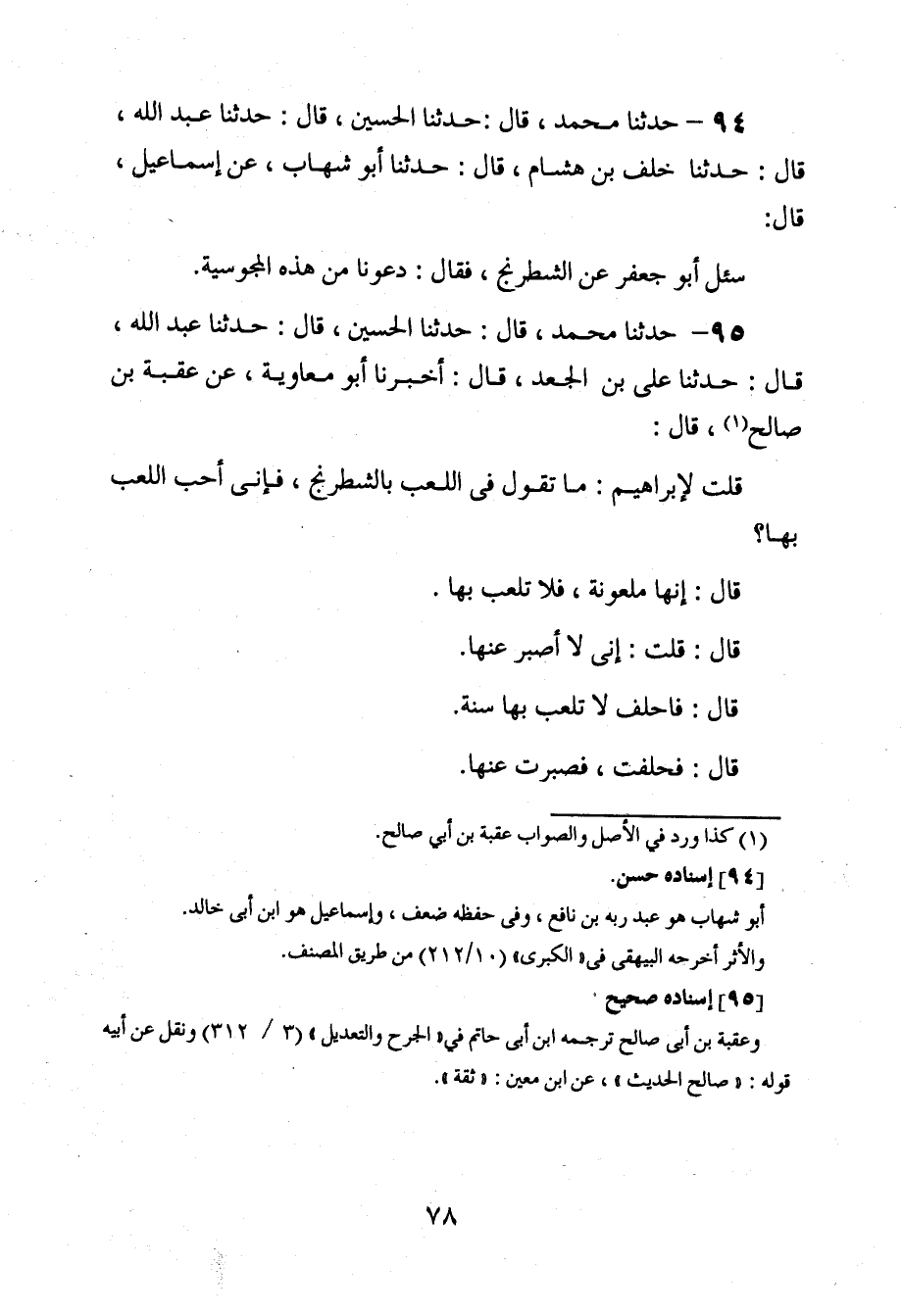 90 - حَدَّثَنَا مُحَمَّدٌ، قَالَ: حَدَّثَنَا الْحُسَيْنُ، قَالَ: حَدَّثَنَا عَبْدُ اللَّهِ، قَالَ: حَدَّثَنَا عَلِيُّ بْنُ الْجَعْدِ , قَالَ: أَخْبَرَنَا أَبُو مُعَاوِيَةَ , عَنْ عُقْبَةَ بْنِ صَالِحٍ , وَقَالَ: قُلْتُ لِإِبْرَاهِيمَ: " مَا تَقُولُ فِي §اللَّعِبِ بِالشِّطْرَنْجِ فَإِنِّي أُحِبُّ اللَّعِبَ بِهَا؟ قَالَ: إِنَّهَا مَلْعُونَةٌ , فَلَا تَلْعَبْ بِهَا , قَالَ: قُلْتُ: إِنَّى لَا أَصْبِرُ عَنْهَا , قَالَ: فَاحْلِفْ لَا تَلْعَبُ بِهَا سَنَةً , قَالَ: فَحَلَفْتُ , فَصَبَرْتُ عَنْهَا "