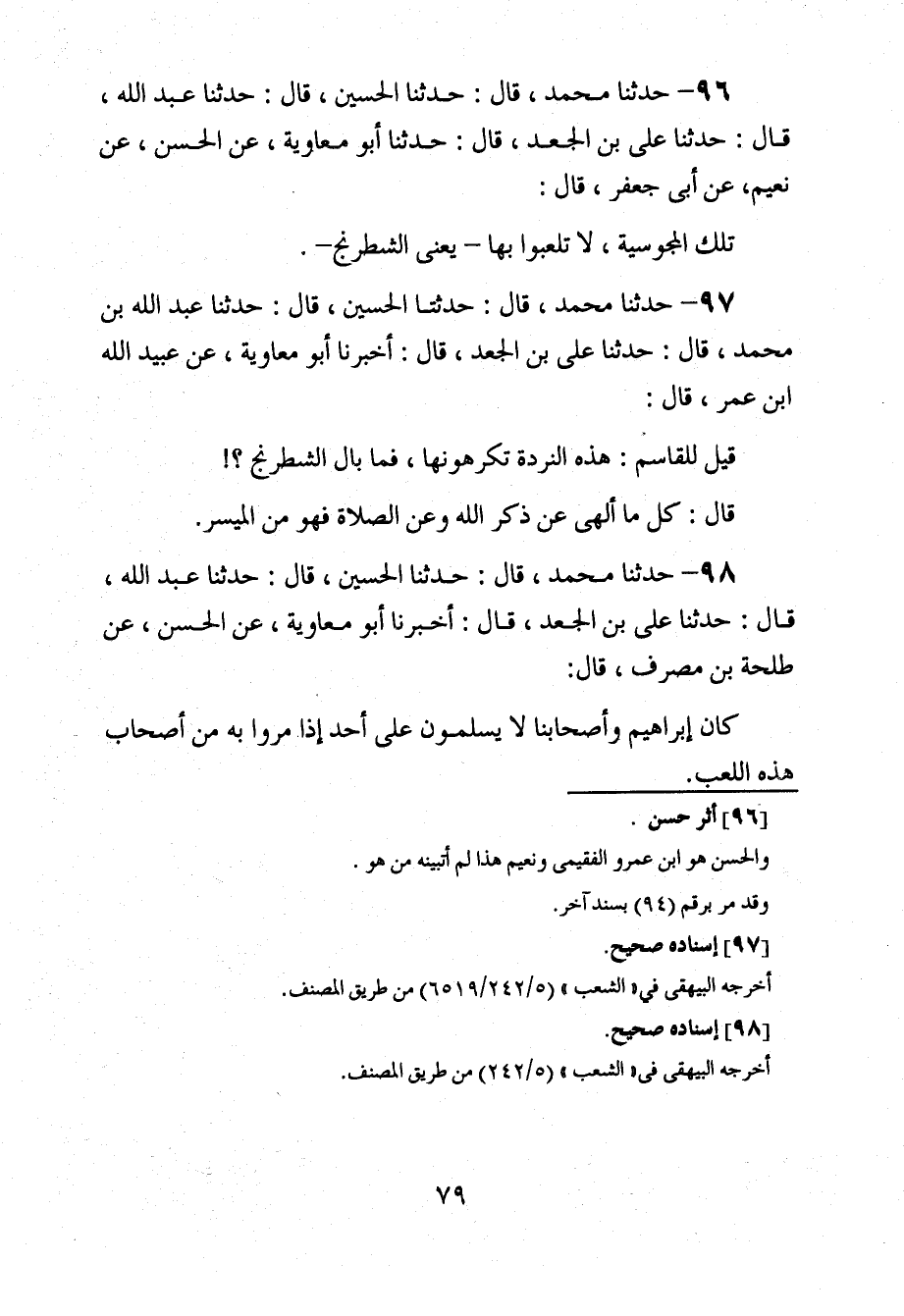 93 - حَدَّثَنَا مُحَمَّدٌ، قَالَ: حَدَّثَنَا الْحُسَيْنُ، قَالَ: حَدَّثَنَا عَبْدُ اللَّهِ، قَالَ: حَدَّثَنَا عَلِيُّ بْنُ الْجَعْدِ , قَالَ: أَخْبَرَنَا أَبُو مُعَاوِيَةَ , عَنِ الْحَسَنِ , عَنْ طَلْحَةَ بْنِ مُصَرِّفٍ , قَالَ: «§كَانَ إِبْرَاهِيمُ وَأَصْحَابُنَا لَا يُسَلِّمُونَ عَلَى أَحَدٍ إِذَا مَرُّوا بِهِ مِنْ أَصْحَابِ هَذِهِ اللُّعَبِ»
