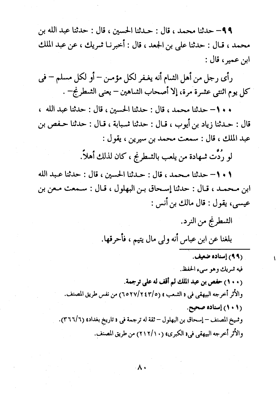 95 - حَدَّثَنَا مُحَمَّدٌ، قَالَ: حَدَّثَنَا الْحُسَيْنُ، قَالَ: حَدَّثَنَا عَبْدُ اللَّهِ، قَالَ: حَدَّثَنَا زِيَادُ بْنُ أَيُّوبَ , قَالَ: حَدَّثَنَا شَبَابَةُ , قَالَ: حَدَّثَنَا حَفْصُ بْنُ عَبْدِ الْمَلِكِ , قَالَ: سَمِعْتُ مُحَمَّدَ بْنَ سِيرِينَ , يَقُولُ: «§لَوْ رُدَّتْ شَهَادَةُ مَنْ يَلْعَبُ بِالشِّطْرَنْجِ , كَانَ لِذَلِكَ أَهْلًا»
