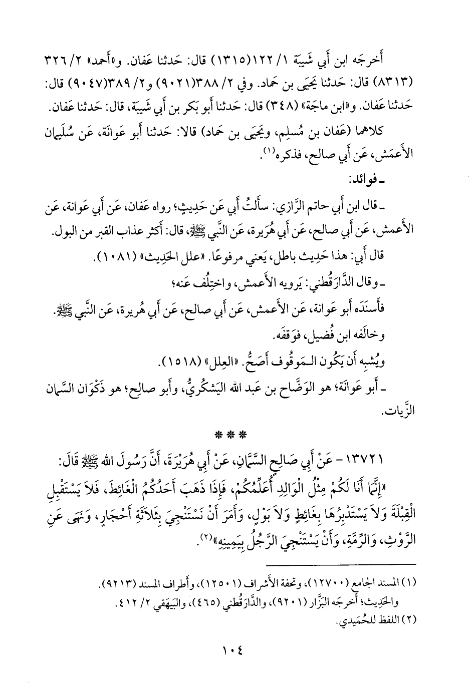 - قلنا: إِسناده ضعيفٌ؛ قال ابن أبي حاتم الرازي: سألتُ أبي عن حديثٍ؛ رواه عفان، عن أبي عَوانة، عن الأعمش، عن أبي صالح، عن أبي هريرة، عن النبي صَلى الله عَليه وسَلم قال: أكثر عذاب القبر من البول.