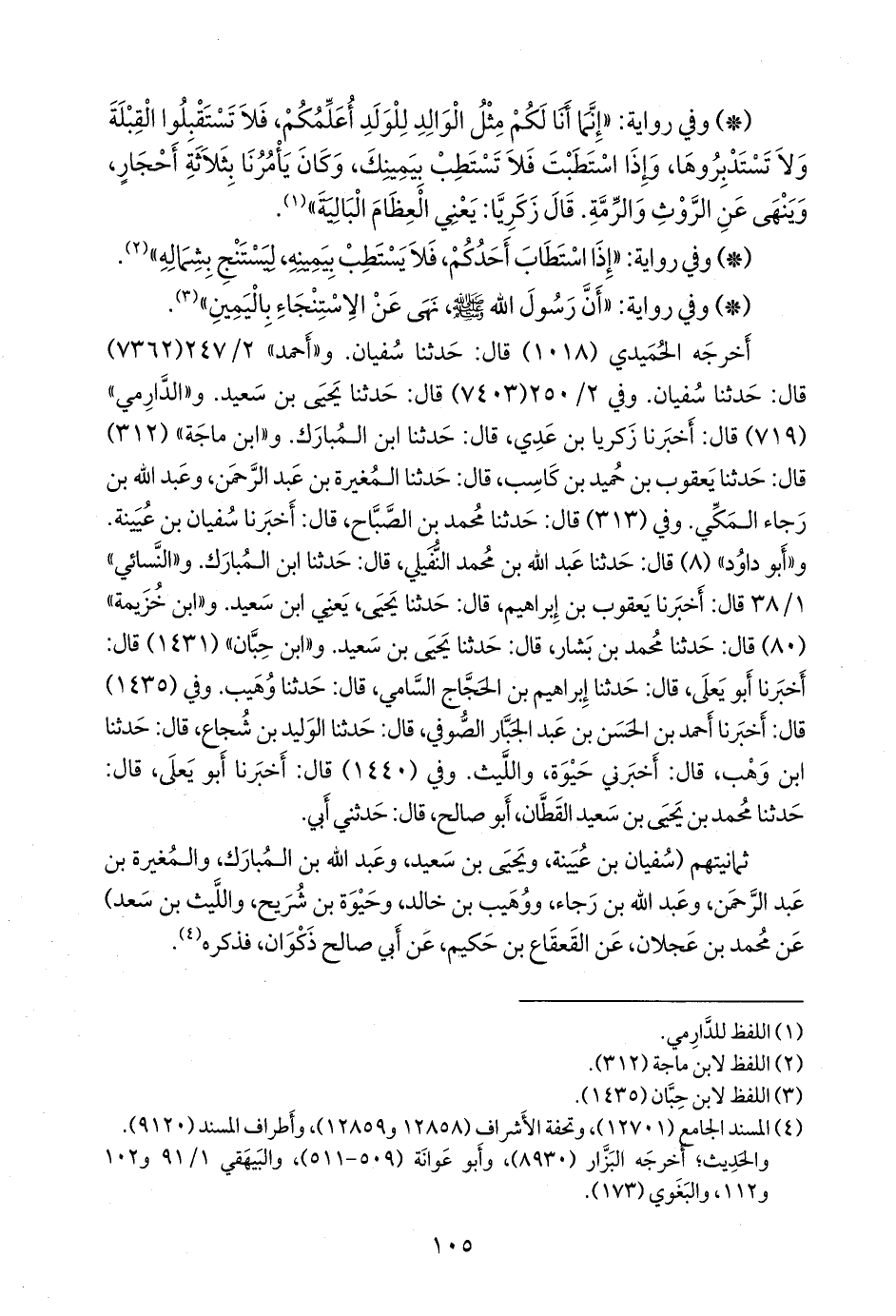 وفي (٣١٣) قال: حدثنا محمد بن الصباح، قال: أخبرنا سفيان بن عُيينة. و «أَبو داود» (٨) قال: حدثنا عبد الله بن محمد النفيلي، قال: حدثنا ابن المبارك. و «النَّسَائي» ١/ ٣٨ قال: أخبرنا يعقوب بن إبراهيم، قال: حدثنا يحيى، يعني ابن سعيد. و «ابن خزيمة» (٨٠) قال: حدثنا محمد بن بشار، قال: حدثنا يحيى بن سعيد. و «ابن حِبَّان» (١٤٣١) قال: أخبرنا أَبو يَعلى، قال: حدثنا إبراهيم بن الحجاج السامي، قال: حدثنا وهيب. وفي (١٤٣٥) قال: أخبرنا أحمد بن الحسن بن عبد الجبار الصوفي، قال: حدثنا الوليد بن شجاع، قال: حدثنا ابن وهب، قال: أخبرني حيوة، والليث. وفي (١٤٤٠) قال: أخبرنا أَبو يَعلى، قال: حدثنا محمد بن يحيى بن سعيد القطان، أَبو صالح، قال: حدثني أبي.