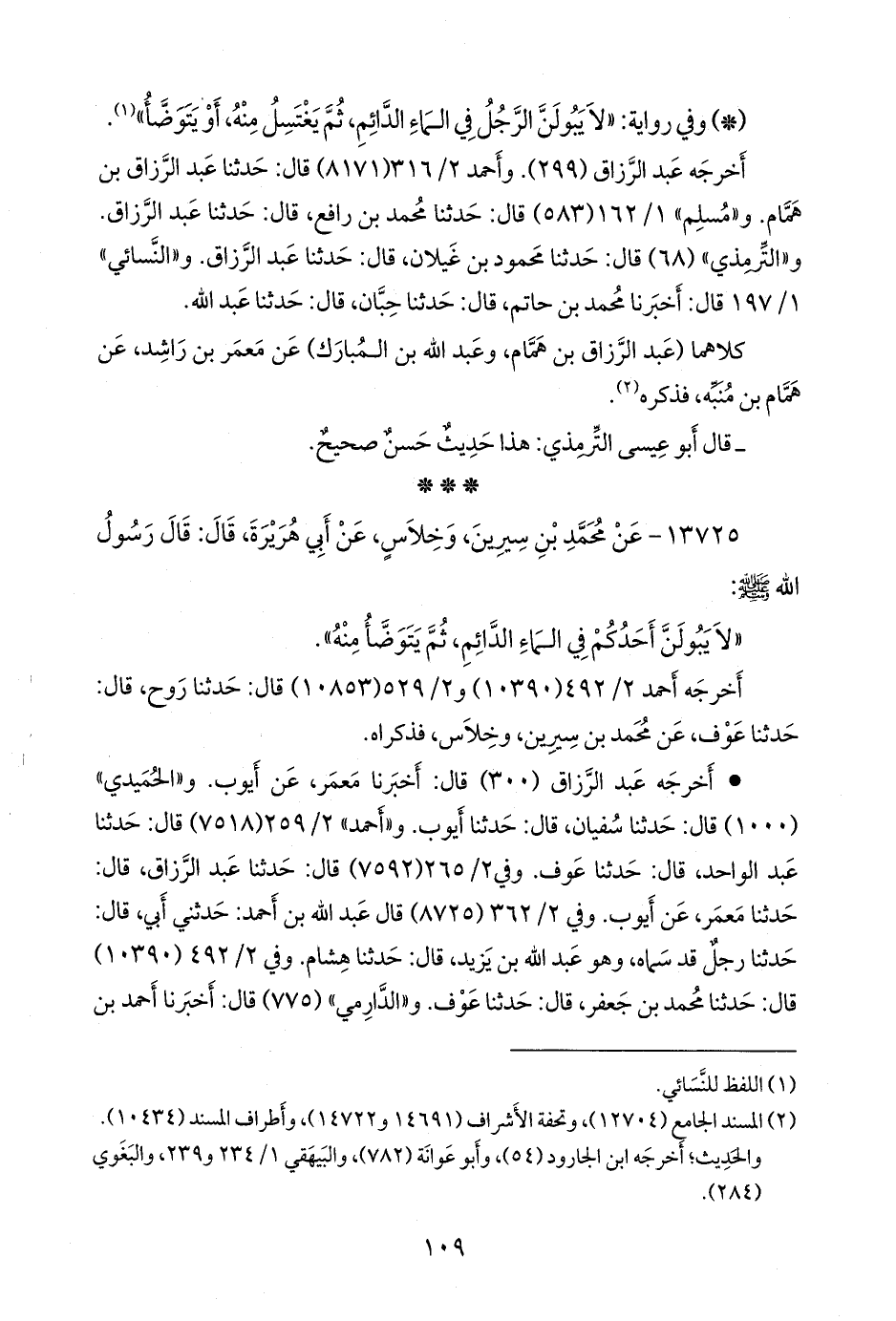 - وفي رواية: «أن رسول الله صَلى الله عَليه وسَلم نهى أن يبال في الماء الدائم، ثم يتوضأ منه» (¬٤).