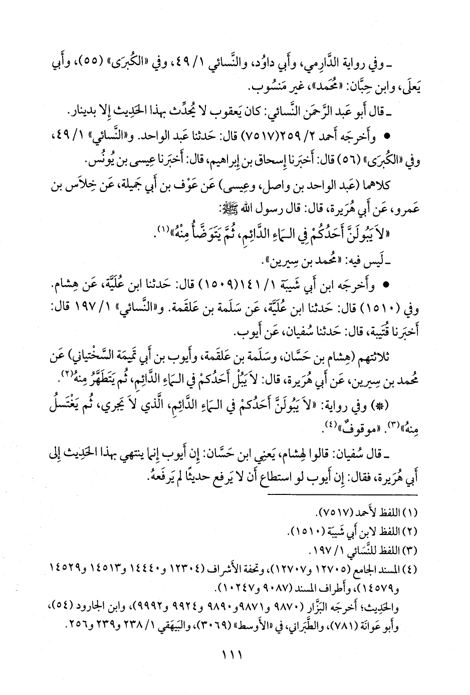 ثلاثتهم (هشام بن حسان، وسلمة بن علقمة، وأيوب بن أبي تميمة السَّخْتِياني) عن محمد بن سِيرين، عن أبي هريرة، قال: لا يبل أحدكم في الماء الدائم، ثم يتطهر منه (¬١).