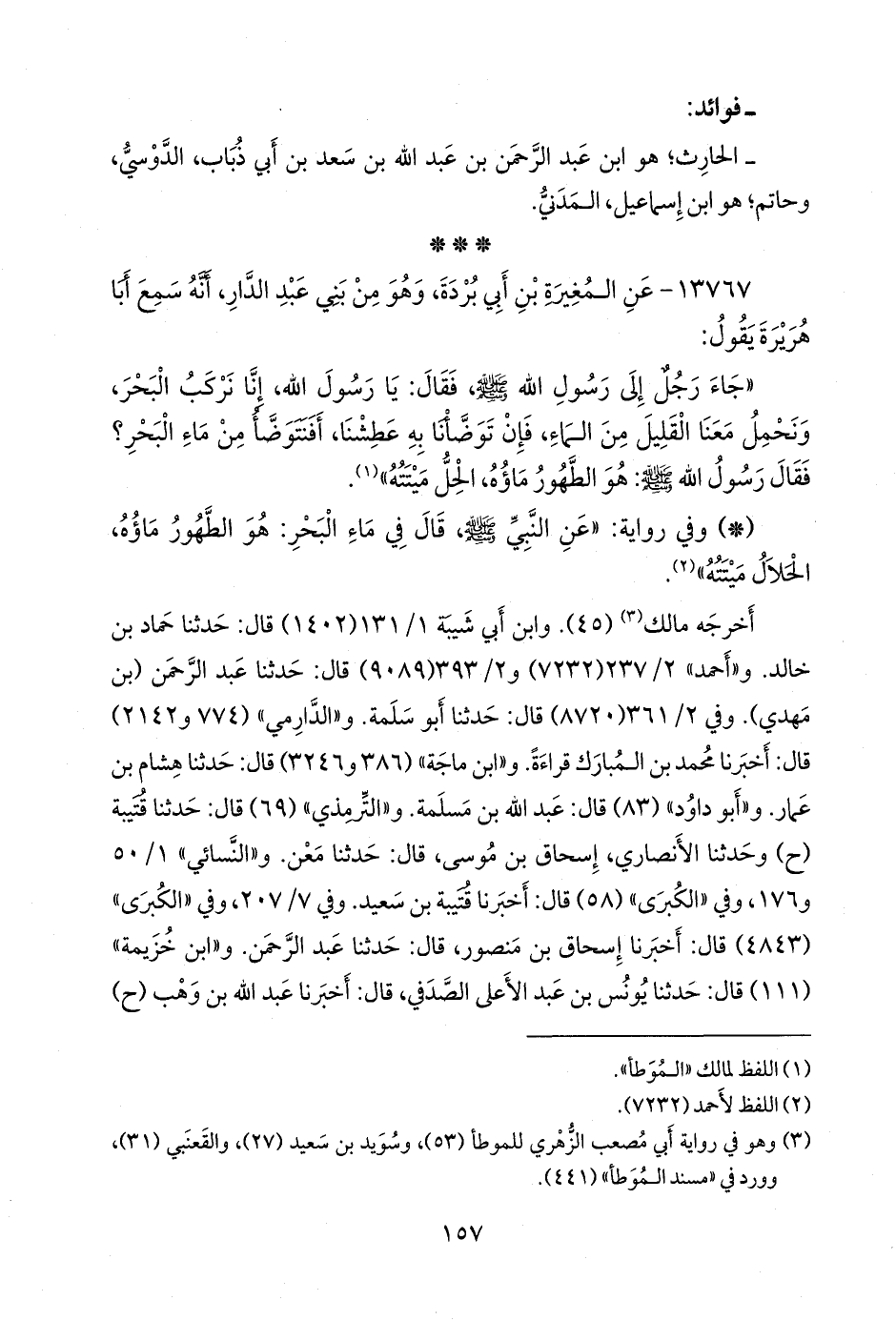 - وفي رواية: «عن النبي صَلى الله عَليه وسَلم قال في ماء البحر: هو الطهور ماؤه، الحلال ميتته» (¬٢).