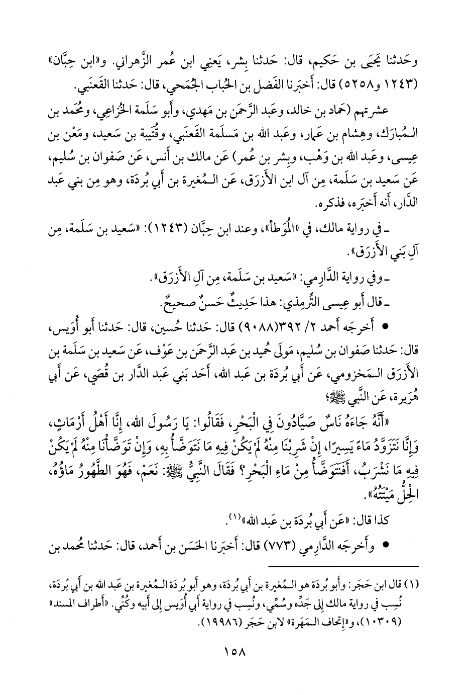 «أنه جاءه ناس صيادون في البحر، فقالوا: يا رسول الله، إنا أهل أرماث، وإنا نتزود ماء يسيرا، إن شربنا منه لم يكن فيه ما نتوضأ به، وإن توضانا منه لم يكن فيه ما نشرب، أفنتوضأ من ماء البحر؟ فقال النبي صَلى الله عَليه وسَلم: نعم، فهو الطهور ماؤه، الحل ميتته».