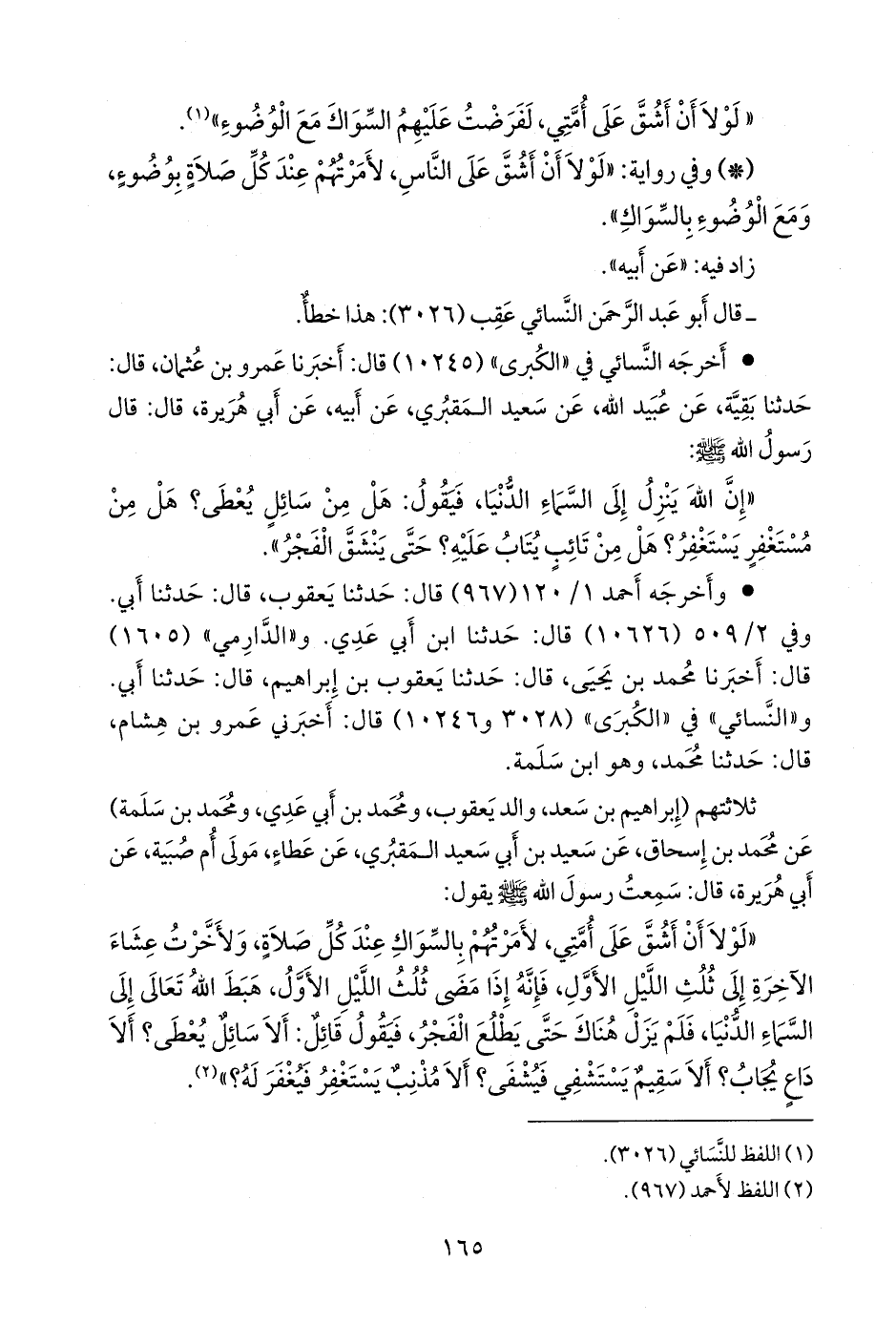 «لولا أن أشق على أمتي، لأمرتهم بالسواك عند كل صلاة، ولأخرت عشاء الآخرة إلى ثلث الليل الأول، فإنه إذا مضى ثلث الليل الأول، هبط الله تعالى إلى السماء الدنيا، فلم يزل هناك حتى يطلع الفجر، فيقول قائل: ألا سائل يعطى؟ ألا داع يجاب؟ ألا سقيم يستشفي فيشفى؟ ألا مذنب يستغفر فيغفر له؟» (¬١)