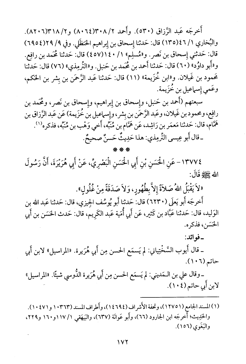 - قلنا: إِسناده ضعيفٌ؛ الحسن بن أَبي الحسن البَصري لم يسمع من أَبي هريرة. انظر فوائد الحديث رقم (١٣٦٤٢).