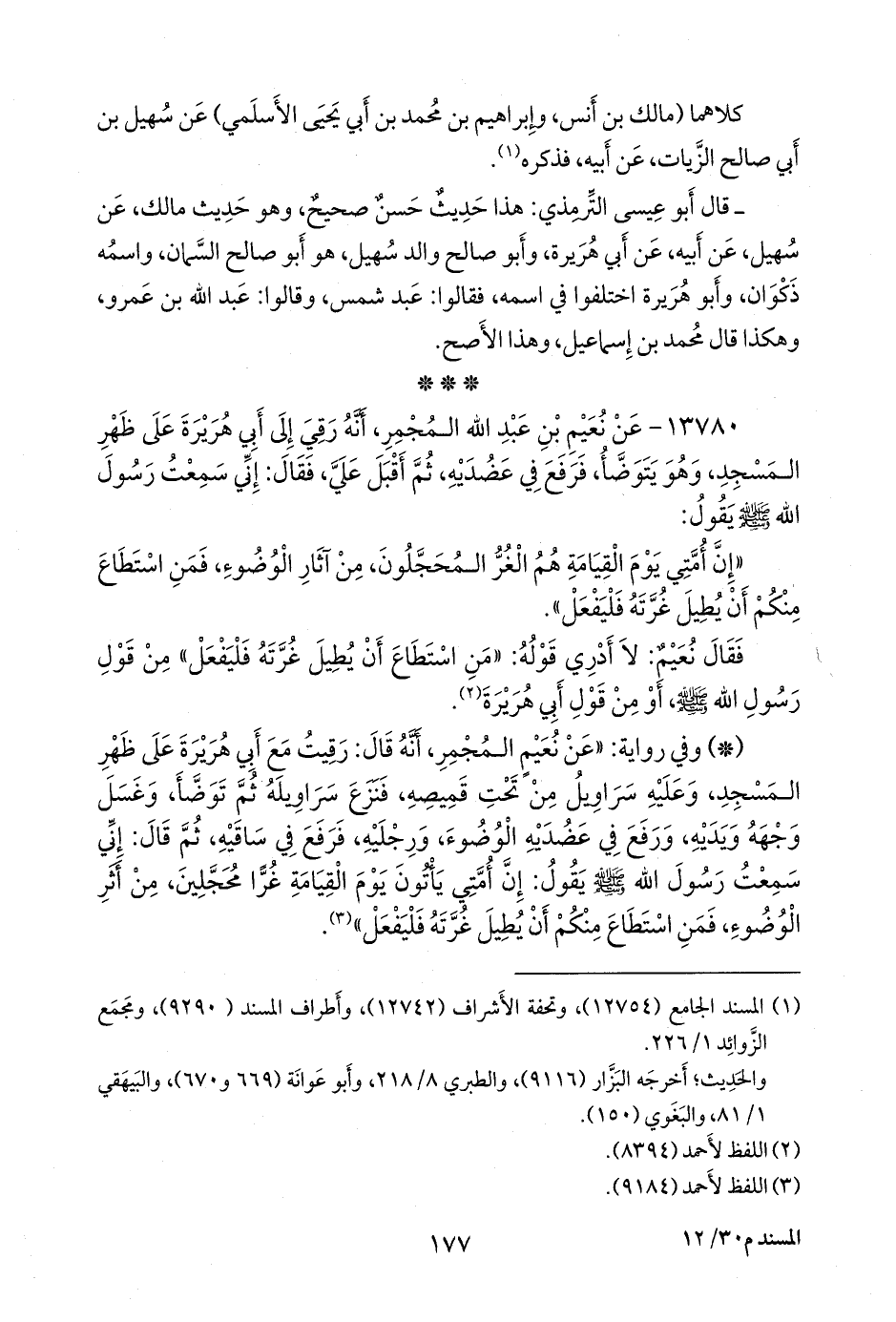 ١٣٧٨٠ - عن نعيم بن عبد الله المجمر، أنه رقي إلى أبي هريرة على ظهر المسجد، وهو يتوضأ، فرفع في عضديه، ثم أقبل علي، فقال: إني سمعت رسول الله صَلى الله عَليه وسَلم يقول: