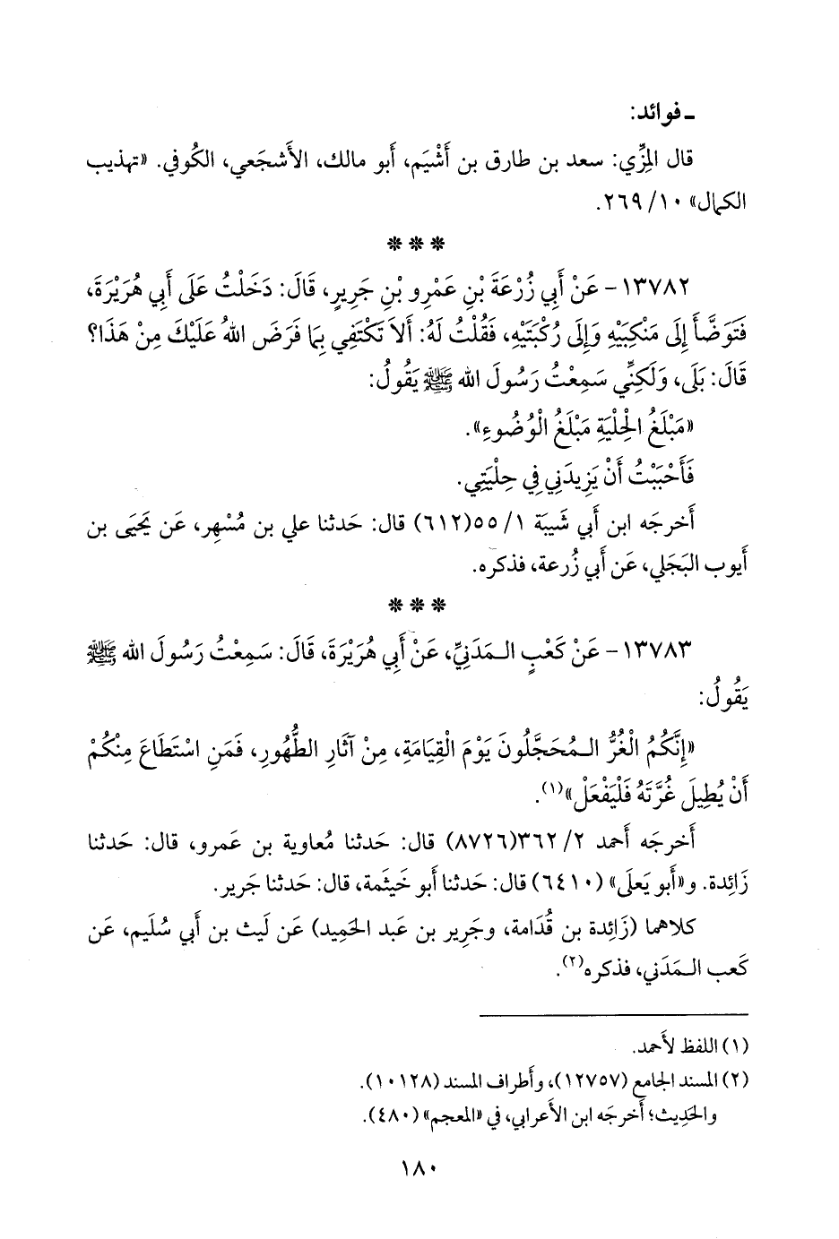 ١٣٧٨٢ - عن أَبي زُرعَة بن عَمرو بن جرير، قال: دخلت على أبي هريرة، فتوضأ إلى منكبيه وإلى ركبتيه، فقلت له: ألا تكتفي بما فرض الله عليك من هذا؟ قال: بلى، ولكني سمعت رسول الله صَلى الله عَليه وسَلم يقول: