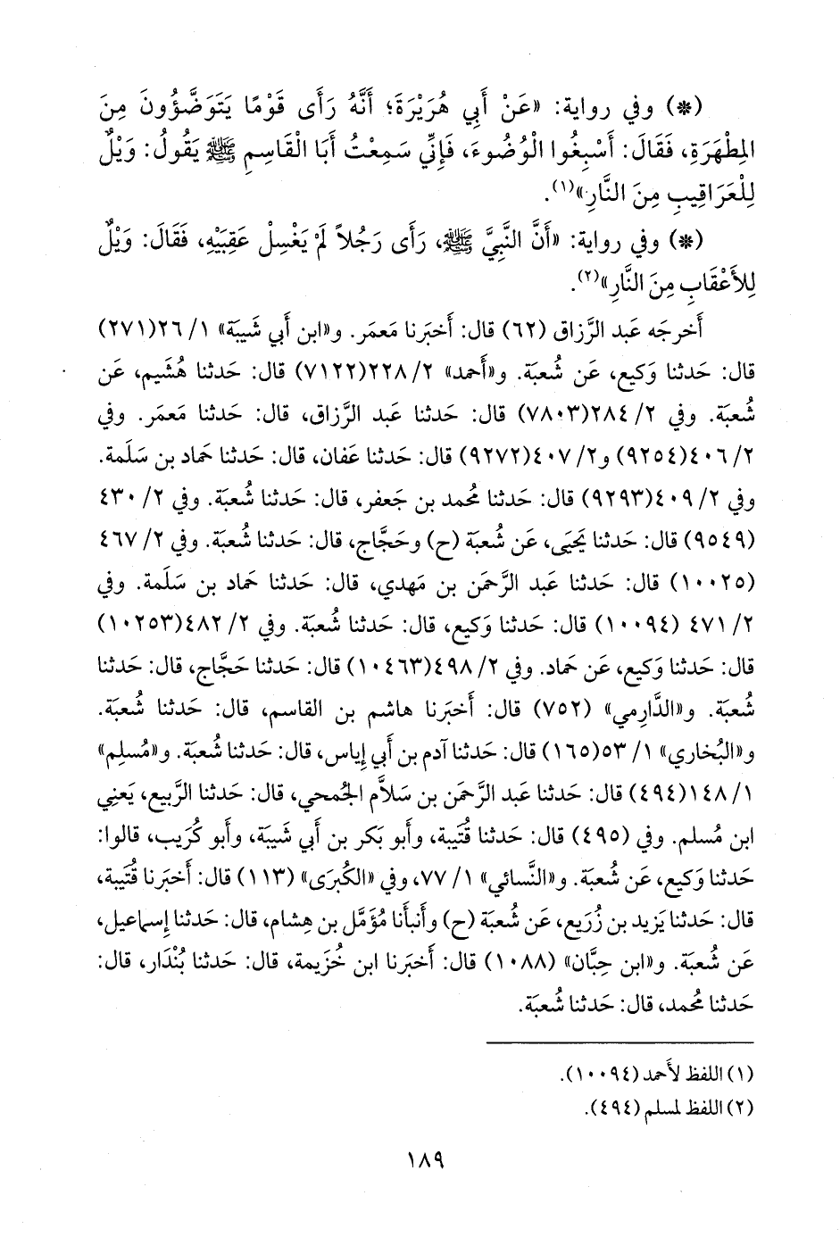 وفي ٢/ ٢٨٤ (٧٨٠٣) قال: حدثنا عبد الرزاق، قال: حدثنا مَعمَر. وفي ٢/ ٤٠٦ (٩٢٥٤) و ٢/ ٤٠٧ (٩٢٧٢) قال: حدثنا عفان، قال: حدثنا حماد بن سلمة. وفي ٢/ ٤٠٩ (٩٢٩٣) قال: حدثنا محمد بن جعفر، قال: حدثنا شعبة. وفي ٢/ ٤٣٠ (٩٥٤٩) قال: حدثنا يحيى، عن شعبة (ح) وحجاج، قال: حدثنا شعبة. وفي ٢/ ٤٦٧ (١٠٠٢٥) قال: حدثنا عبد الرَّحمَن بن مهدي، قال: حدثنا حماد بن سلمة. وفي ٢/ ٤٧١ (١٠٠٩٤) قال: حدثنا وكيع، قال: حدثنا شعبة. وفي ٢/ ٤٨٢ (١٠٢٥٣) قال: حدثنا وكيع، عن حماد. وفي ٢/ ٤٩٨ (١٠٤٦٣) قال: حدثنا حجاج، قال: حدثنا شعبة. و «الدَّارِمي» (٧٥٢) قال: أخبرنا هاشم بن القاسم، قال: حدثنا شعبة. و «البخاري» ١/ ٤٤ (١٦٥) قال: حدثنا آدم بن أبي إياس، قال: حدثنا شعبة. و «مسلم» ١/ ١٤٨ (٤٩٤) قال: حدثنا عبد الرَّحمَن بن سلام الجُمحي، قال: حدثنا الربيع، يعني ابن مسلم. وفي (٤٩٥) قال: حدثنا قتيبة، وأَبو بكر بن أبي شيبة، وأَبو كُريب، قالوا: حدثنا وكيع، عن شعبة. و «النَّسَائي» ١/ ٧٧، وفي «الكبرى» (١١٣) قال: أخبرنا قتيبة، قال: حدثنا يزيد بن زُريع، عن شعبة (ح) وأنبأنا مُؤَمَّل بن هشام، قال: حدثنا إسماعيل، عن شعبة. و «ابن حِبَّان» (١٠٨٨) قال: أخبرنا ابن خزيمة، قال: حدثنا بُندَار، قال: حدثنا محمد، قال: حدثنا شعبة.