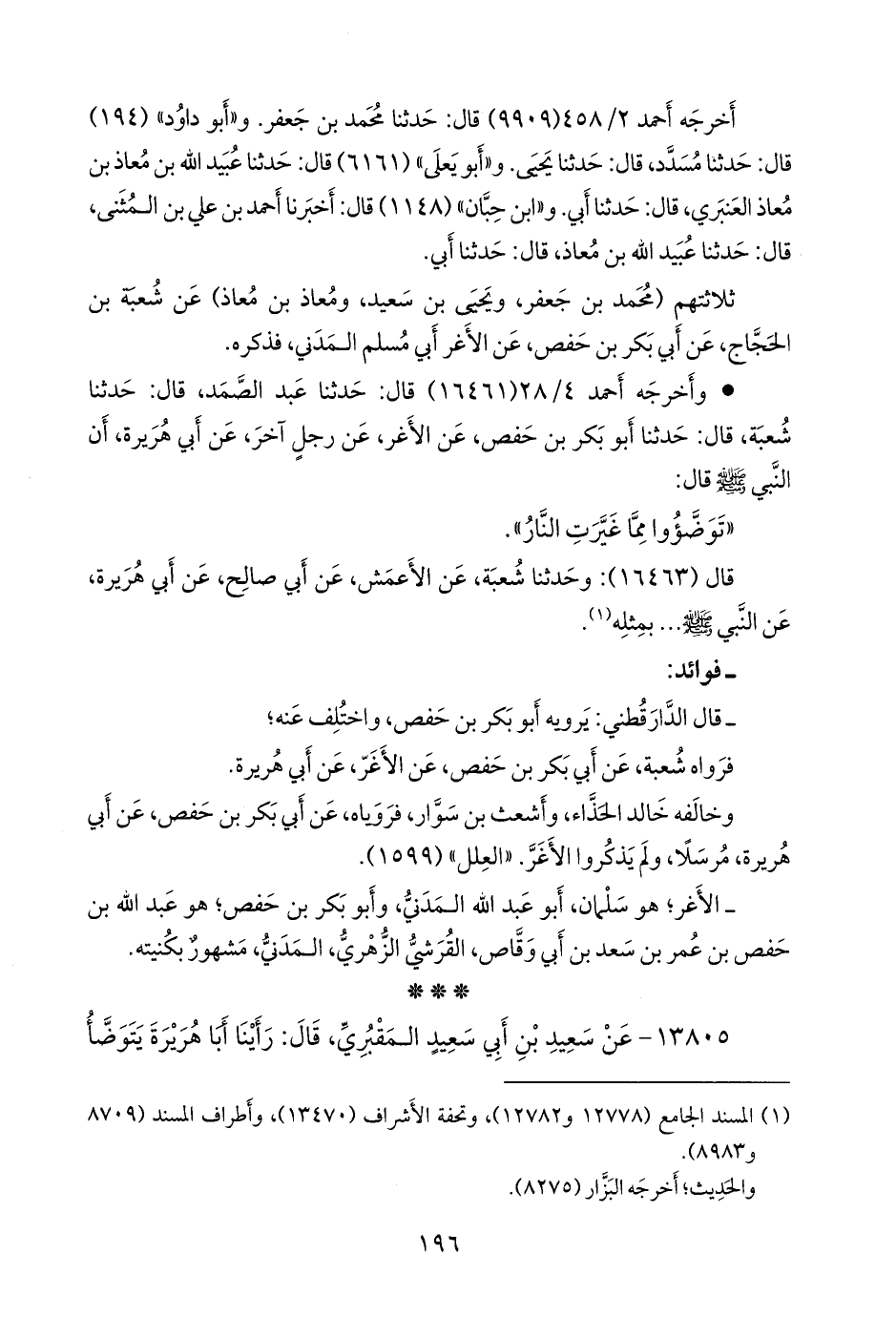 ١٣٨٠٥ - عن سعيد بن أبي سعيد المَقبُري، قال: رأينا أبا هريرة يتوضأ