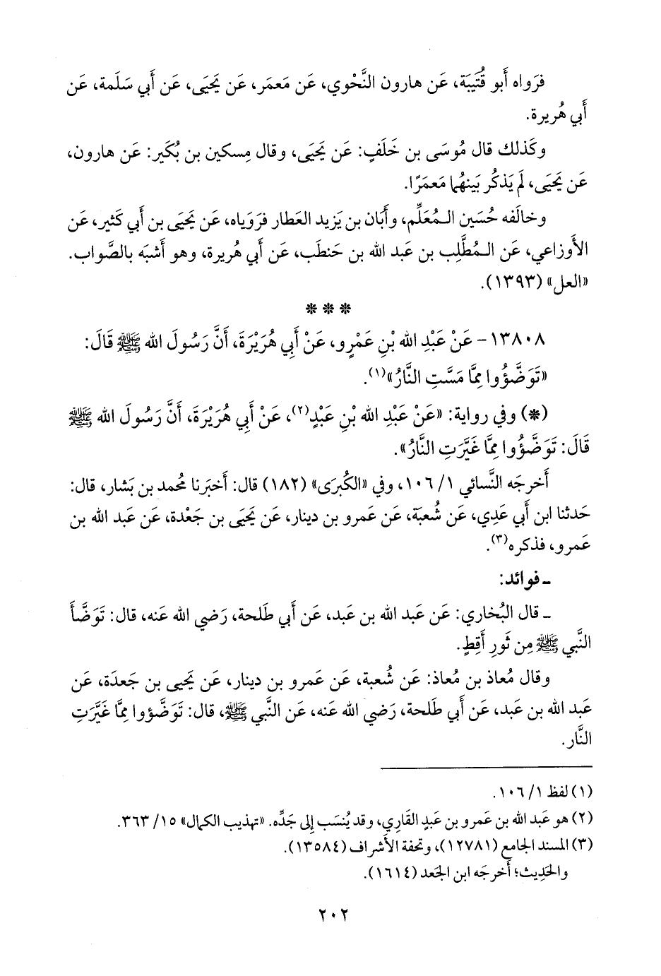 - وفي رواية: «عن عبد الله بن عبد (¬٢)، عن أبي هريرة، أن رسول الله صَلى الله عَليه وسَلم قال: توضؤوا مما غيرت النار».