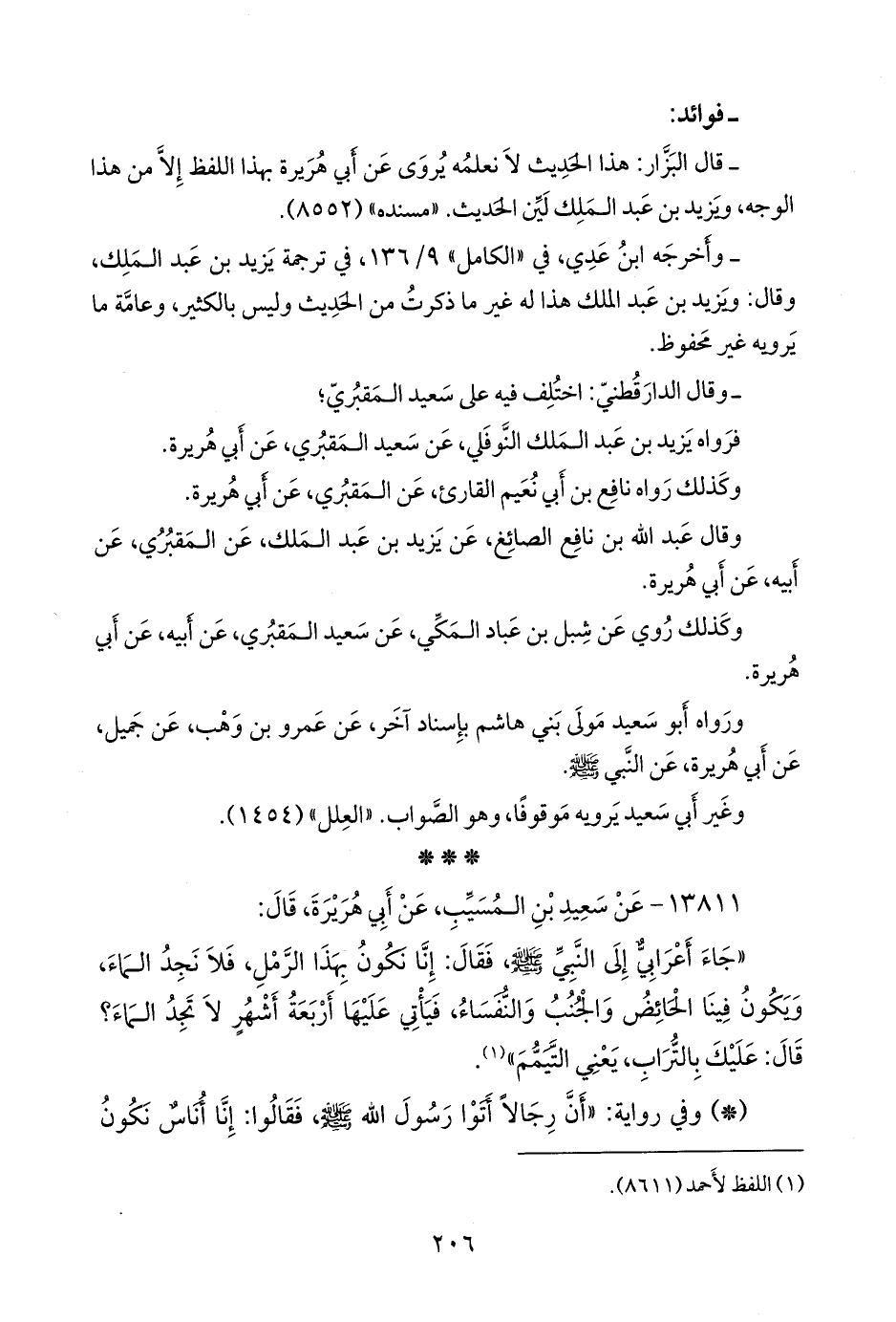 - قال البزار: هذا الحديث لا نعلمه يروى عن أبي هريرة بهذا اللفظ إلا من هذا الوجه، ويزيد بن عبد الملك لين الحديث. «مسنده» (٨٥٥٢).