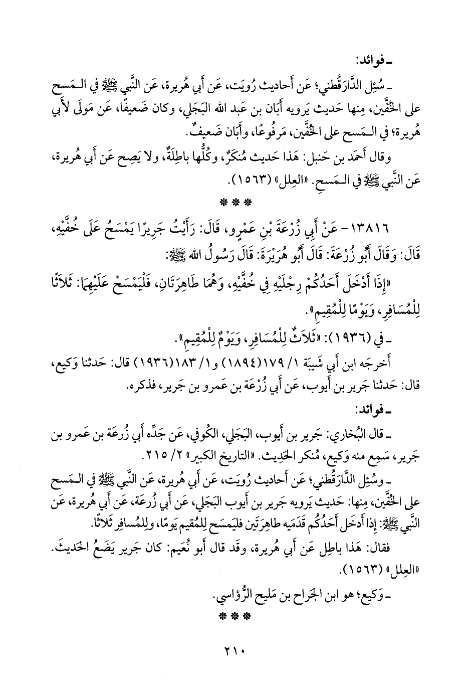 - وسئل الدارقُطني؛ عن أحاديث رويت، عن أبي هريرة، عن النبي صَلى الله عَليه وسَلم في المسح على الخفين، منها: حديث يرويه جَرير بن أيوب البَجَلي، عن أَبي زُرعَة، عن أبي هريرة، عن النبي صَلى الله عَليه وسَلم: إذا أدخل أحدكم قدميه طاهرتين فليمسح للمقيم يوما، وللمسافر ثلاثا.
