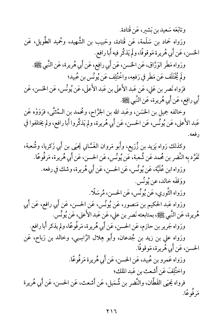 ورواه عبد الحكيم بن منصور، عن يونس، عن الحسن، عن أبي رافع، عن أبي هريرة، عن النبي صَلى الله عَليه وسَلم بمتابعته نصر بن علي، عن عبد الأعلى، عن يونس.
