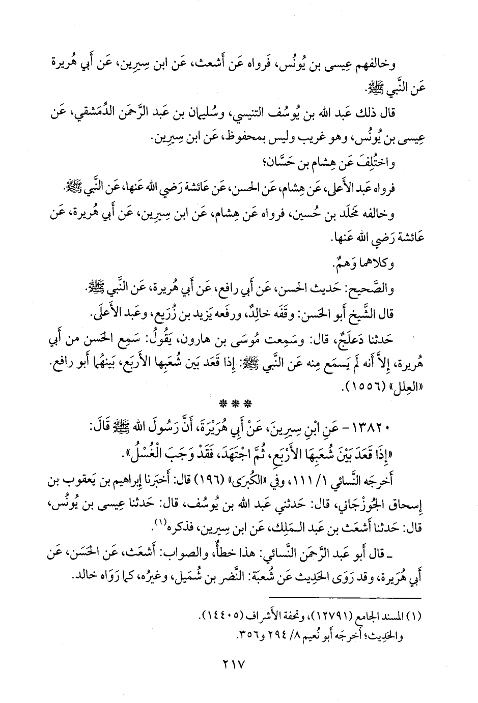- قال أَبو عبد الرَّحمَن النَّسَائي: هذا خطأ والصواب: أشعث، عن الحسن، عن أبي هريرة، وقد روى الحديث عن شعبة: النضر بن شميل، وغيره، كما رواه خالد.