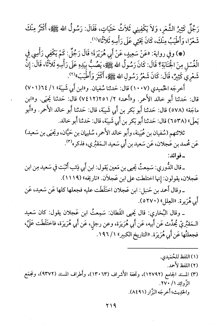- وفي رواية: «عن سعيد، عن أبي هريرة؛ قال رجل: كم يكفي رأسي في الغسل من الجنابة؟ قال: كان رسول الله صَلى الله عَليه وسَلم يصب بيده على رأسه ثلاثا، قال: إن شعري كثير، قال: كان شعر رسول الله صَلى الله عَليه وسَلم أكثر وأطيب» (¬١).