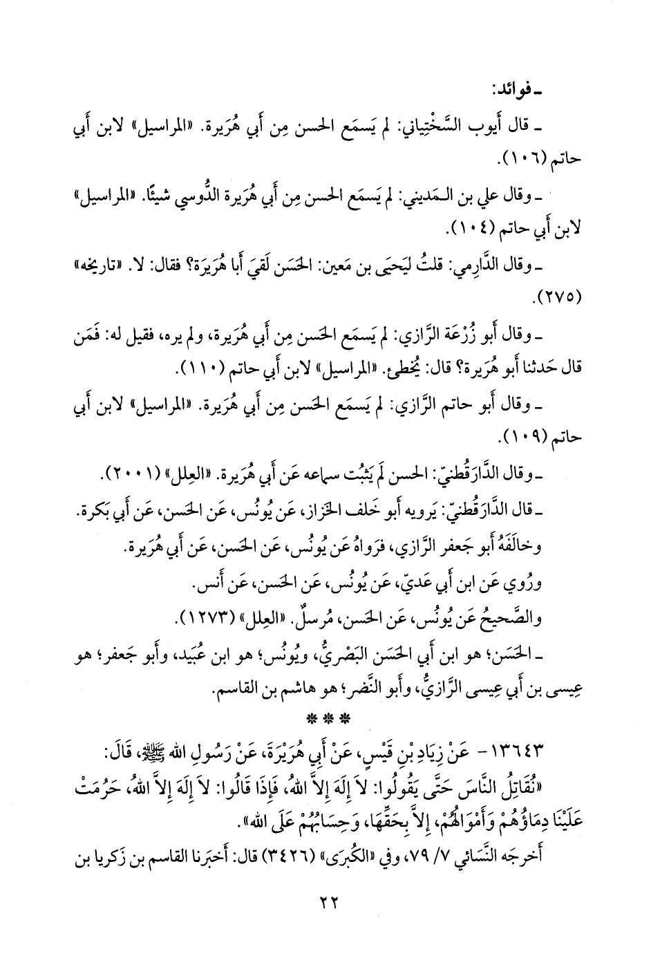 - وقال أَبو حاتم الرازي: لم يسمع الحسن من أبي هريرة. «المراسيل» لابن أبي حاتم (١٠٩).