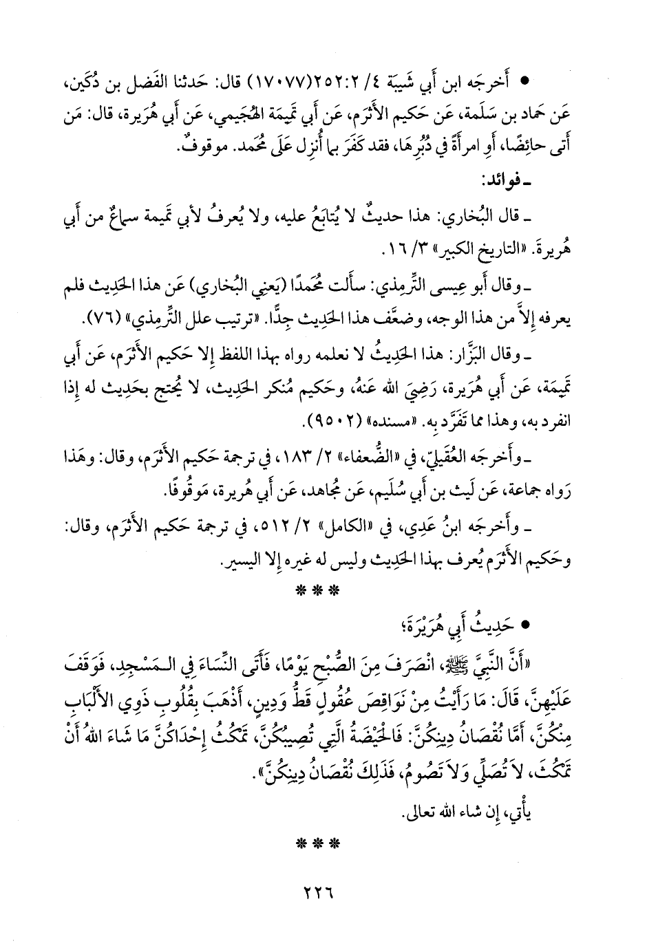- وقال البزار: هذا الحديث لا نعلمه رواه بهذا اللفظ إلا حكيم الأثرم، عن أبي تميمة, عن أبي هريرة، رضي الله عنه, وحكيم منكر الحديث، لا يحتج بحديث له إذا انفرد به، وهذا مما تفرد به. «مسنده» (٩٥٠٢).