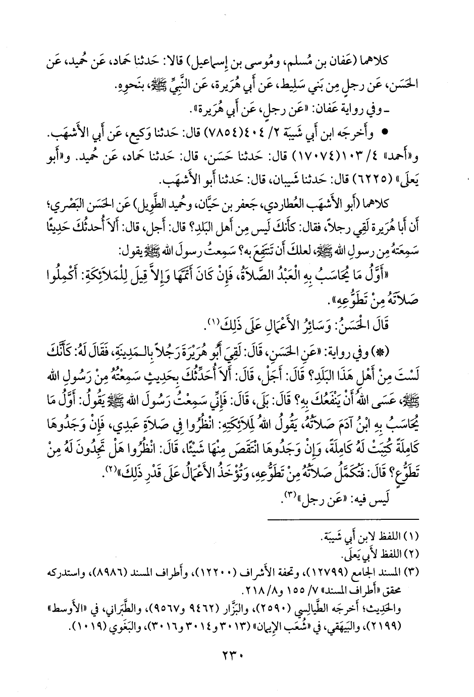 - وفي رواية: «عن الحسن، قال: لقي أَبو هريرة رجلا بالمدينة، فقال له: كأنك لست من أهل هذا البلد؟ قال: أجل، قال: ألا أحدثك بحديث سمعته من رسول الله صَلى الله عَليه وسَلم عسى الله أن ينفعك به؟ قال: بلى، قال: فإني سمعت رسول الله صَلى الله عَليه وسَلم يقول: أول ما يحاسب به ابن آدم صلاته، يقول الله لملائكته: انظروا في صلاة عبدي، فإن وجدوها كاملة كتبت له كاملة، وإن وجدوها انتقص منها شيئا، قال: انظروا هل تجدون له من تطوع؟ قال: فتكمل صلاته من تطوعه، وتؤخذ الأعمال على قدر ذلك» (¬٢).
