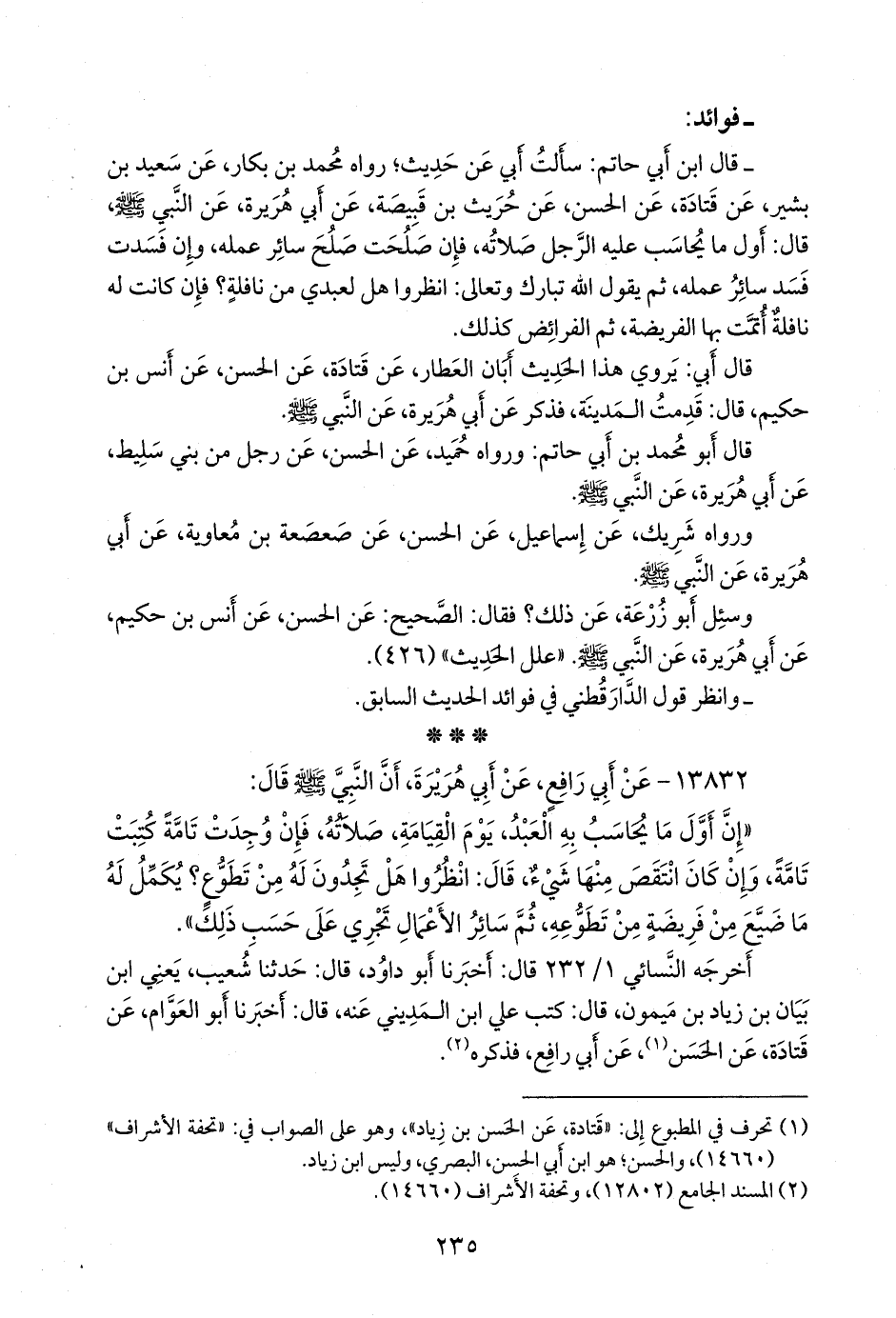 - قال عبد الرَّحمَن بن أبي حاتم الرازي: سألتُ أبي عن حديثٍ؛ رواه محمد بن بكار، عن سعيد بن بشير، عن قتادة، عن الحسن، عن حريث بن قَبيصَة، عن أبي هريرة، عن النبي صَلى الله عَليه وسَلم قال: أول ما يحاسب عليه الرجل صلاته، فإن صلحت صلح سائر عمله، وإن فسدت فسد سائر عمله، ثم يقول الله تبارك وتعالى: انظروا هل لعبدي من نافلة؟ فإن كانت له نافلة أتمت بها الفريضة، ثم الفرائض كذلك.